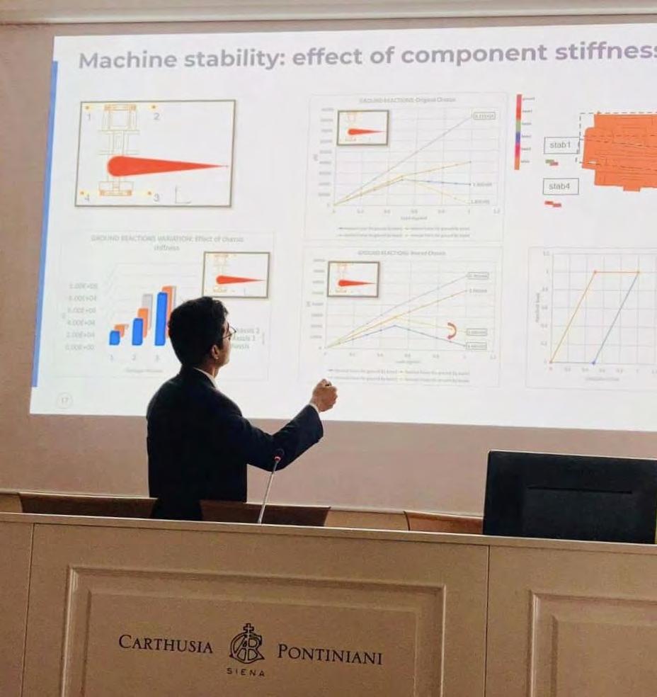 che possono accadere, segue lo sviluppo in house di un nuovo software per i calcoli della stabilità delle macchine e garantisce supporto ai vari ingegneri meccanici. Recentemente, in qualità di ingegnere strutturale FEA di JMG, Narayan è stato uno dei relatori della Conferenza NAFEMS Italia 2024 “Alla Scoperta delle Frontiere dell'Innovazione nella Simulazione Ingegneristica” che si è tenuta la prima settimana di maggio a Siena. L'evento, organizzato dall'associazione internazionale NAFEMS che ha come mission fornire conoscenze, collaborazione internazionale e opportunità educative per l'uso e la convalida della simulazione ingegneristica, è stata una delle diverse Conferenze regionali previste per il 2024 in diversi paesi del Mondo. A Siena si è parlato di Simulazione Multifisica; Analisi Strut-