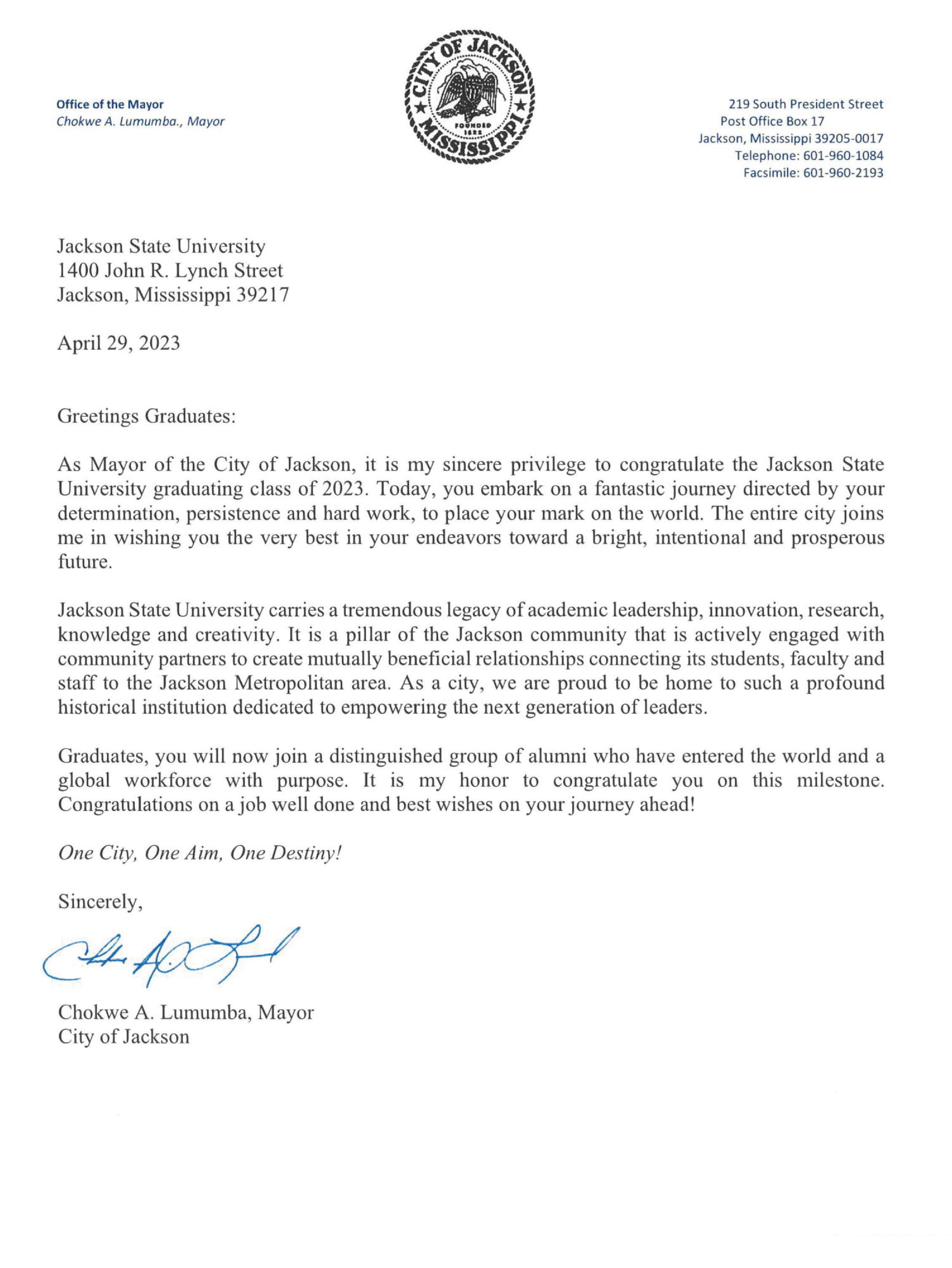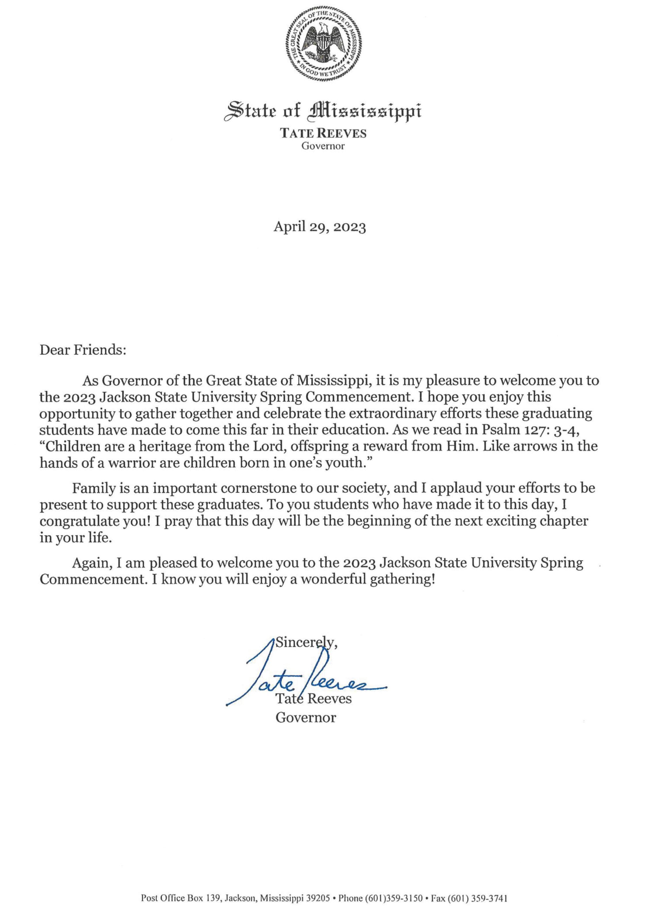 Welcome to the Jackson State University Spring 2023 Commencement Exercises. Commencement is an important event in the life of the University, its students, faculty, and staff. It is a joyous yet solemn event that represents the culmination of the graduates’ years of study. Thank you for joining us and for being a part of the celebration. Again, we welcome you!