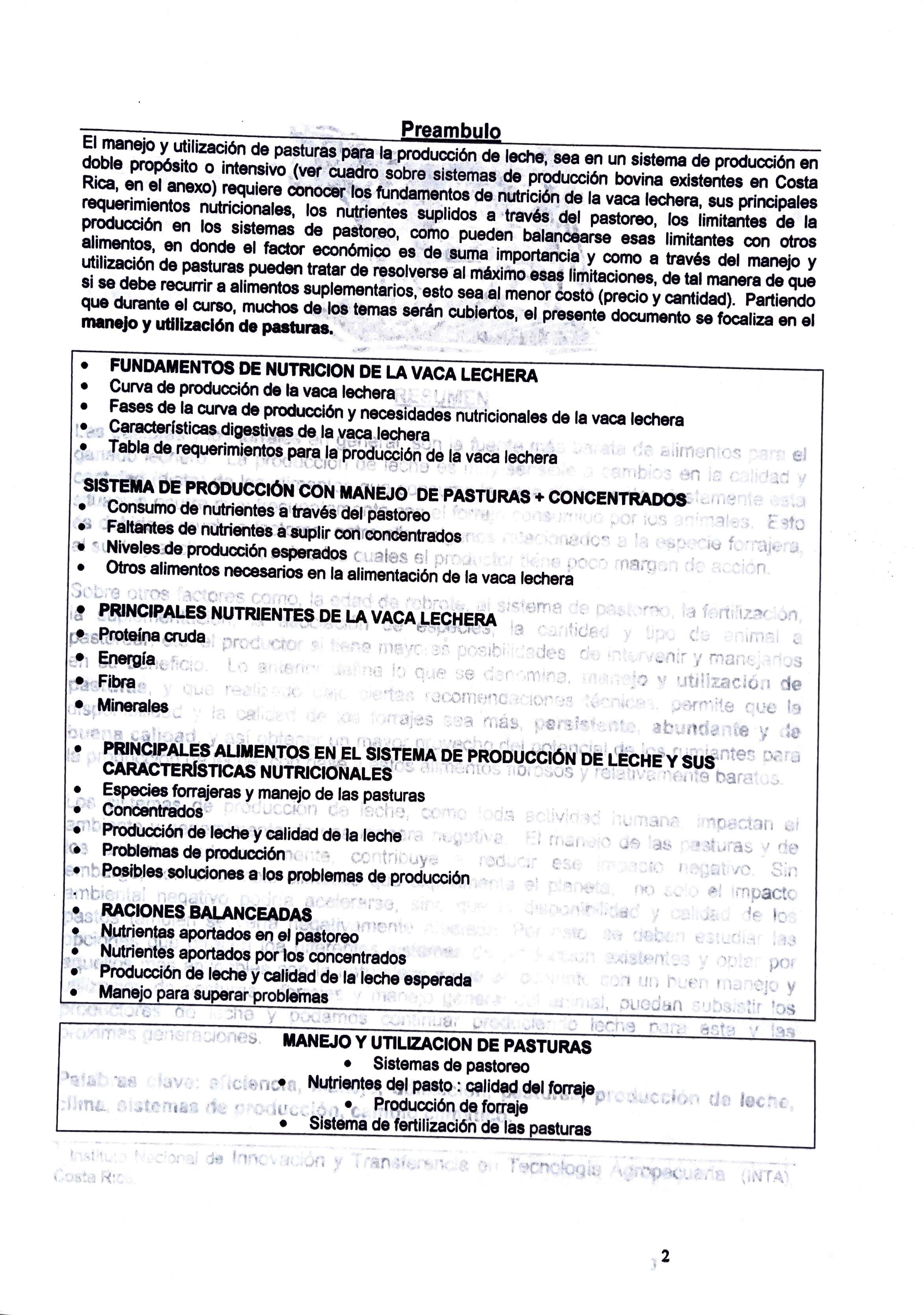 El manejo y utilización de pasturas pe~ l~ producción de leche~sea en un sistema de producción en doble propósito o intensivo (vet cuadró sobre sistemas de producción bovina existentes en Costa Rica, en el anexo) requiere conóCer Íos fundamentos de nutrición de la vaca lechera, sus principales requerimientos nutricionales, los nutrientes suplidos a través, del pastoreo, los limitantes de la producción en los sistemas de pastoreo, como pueden balancearse esas limitantes con otros alimentos, en donde el factor económico es de sµrna importancia~y como a través del manejo y utilización de pasturas pueden tratar de resolverse al méxifno esas limitaciones, de tal manera de que si se debe recurrir a alimentos suplementarios, esto sea al menor &>stó (precio y cantidad). Partiendo que durante el curso, muchos de los temas serén cubiertos, el presente documento se focaliza en el manejo y utlllzaclón de pasturas. "