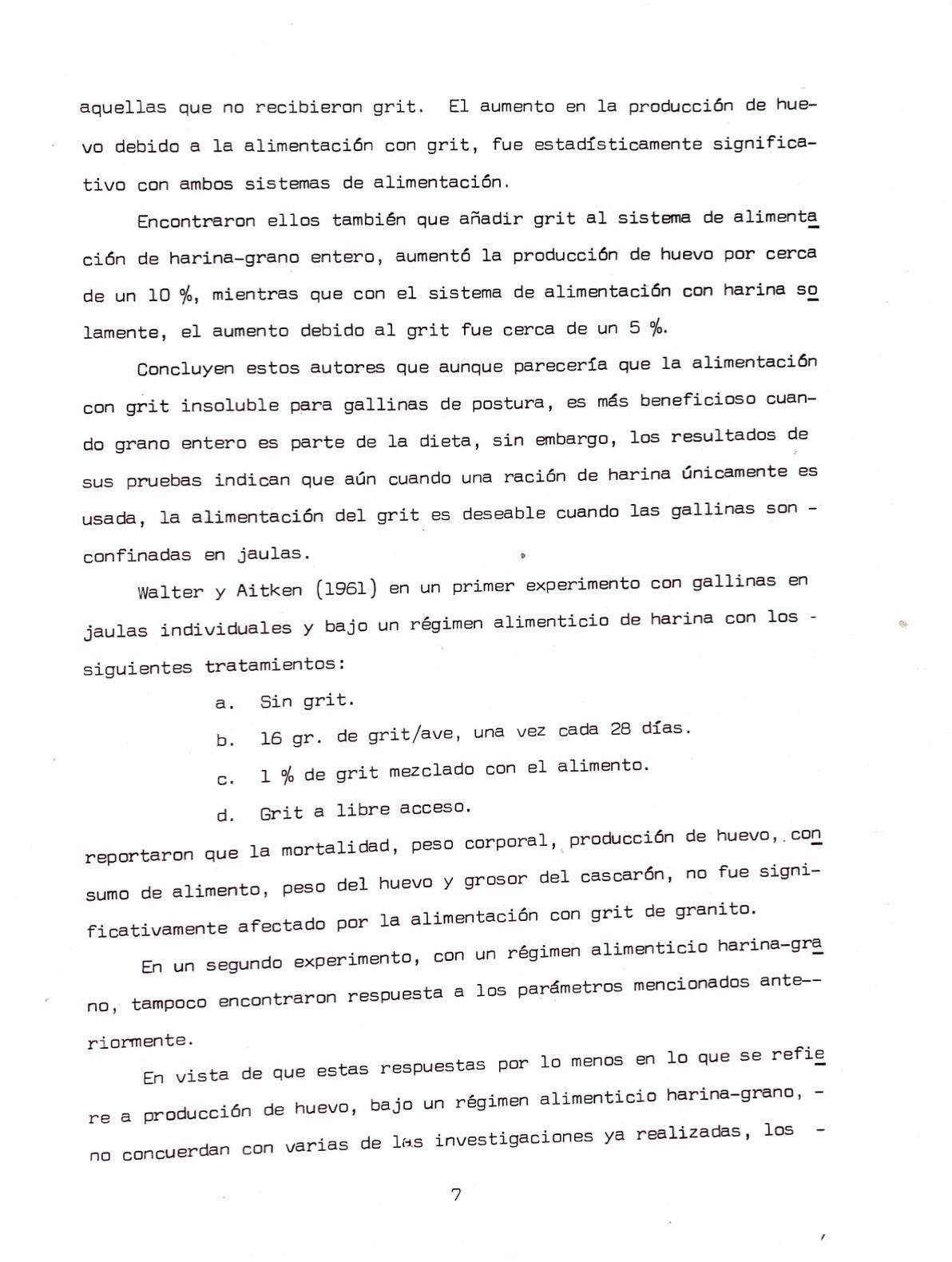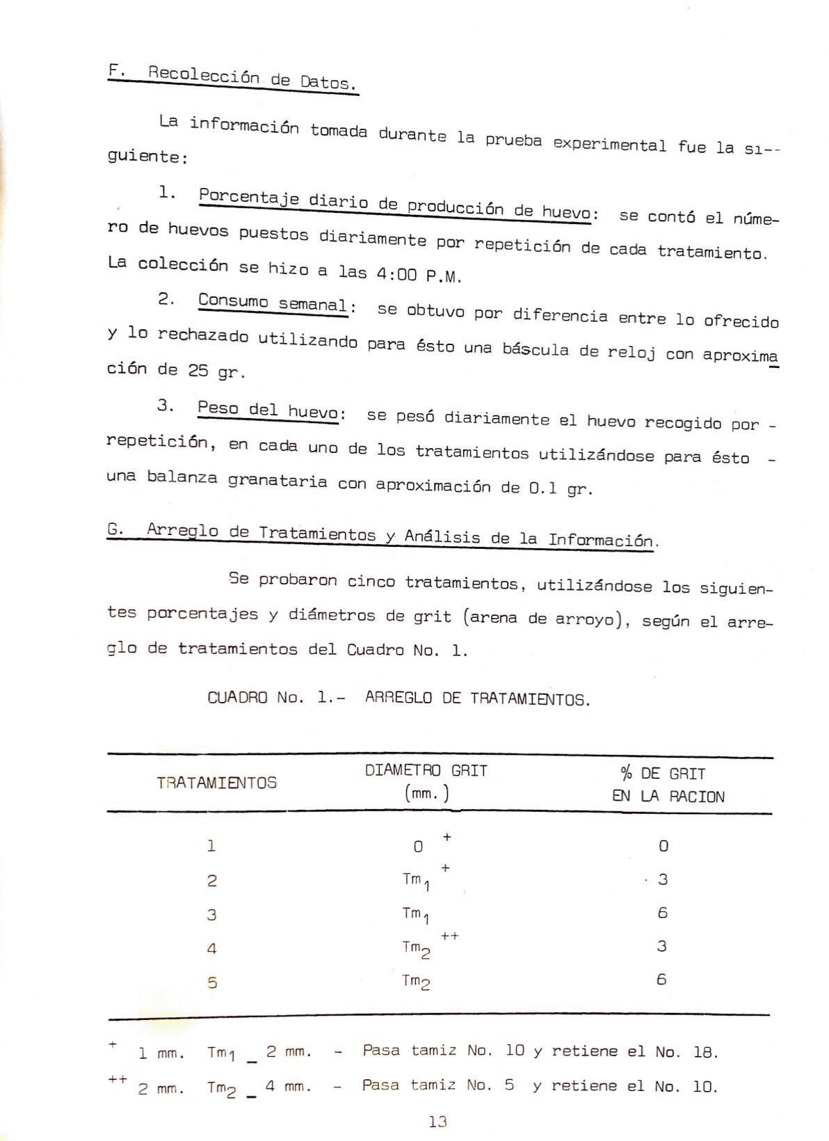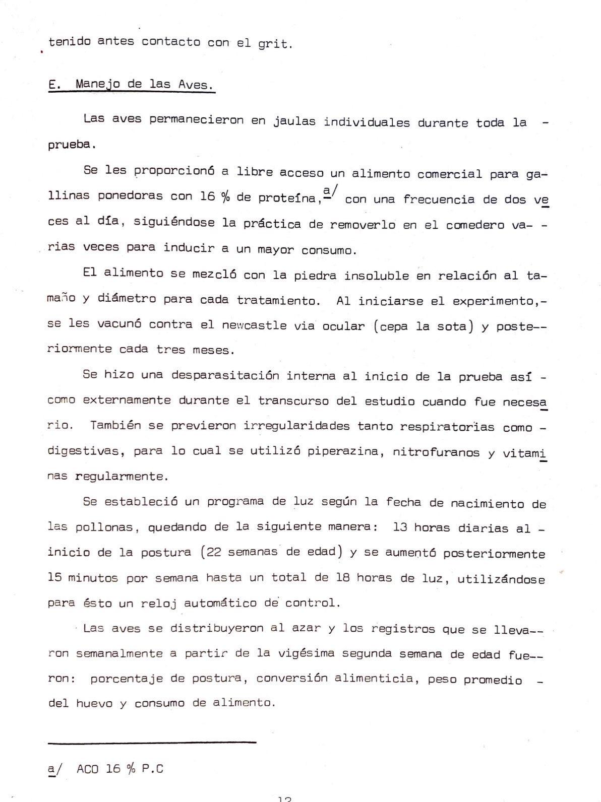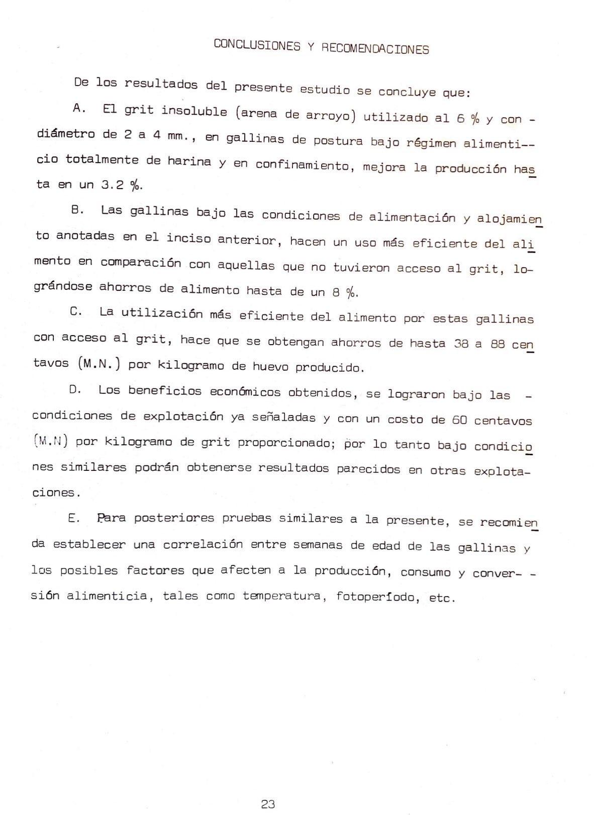 1. Determine the effect of different levels of grit as well as of the diameter of the same on egg production and feed conversion efficiency.
