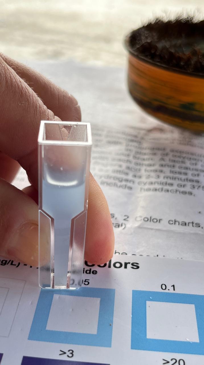 1) MUESTRA LECHE. Se tomo 1 cc de leche y se agito en un envase con 50cc de agua destilada. Se tomo una submuestra de 2cc con la micro-cubeta. Se aplico reactivo No 1 y reactivo No 2, agitándose por 30‘’. La mezcla se dejó en reposo por 10‘, momento de retiro de las dos tiritas con ambos reactivos. El líquido fue tomando coloración celeste, pero más claro que el del ensilaje. De todas maneras, el indicador ubico el color en la 2ª casetilla de 0,05 ppm, igual que el caso anterior.