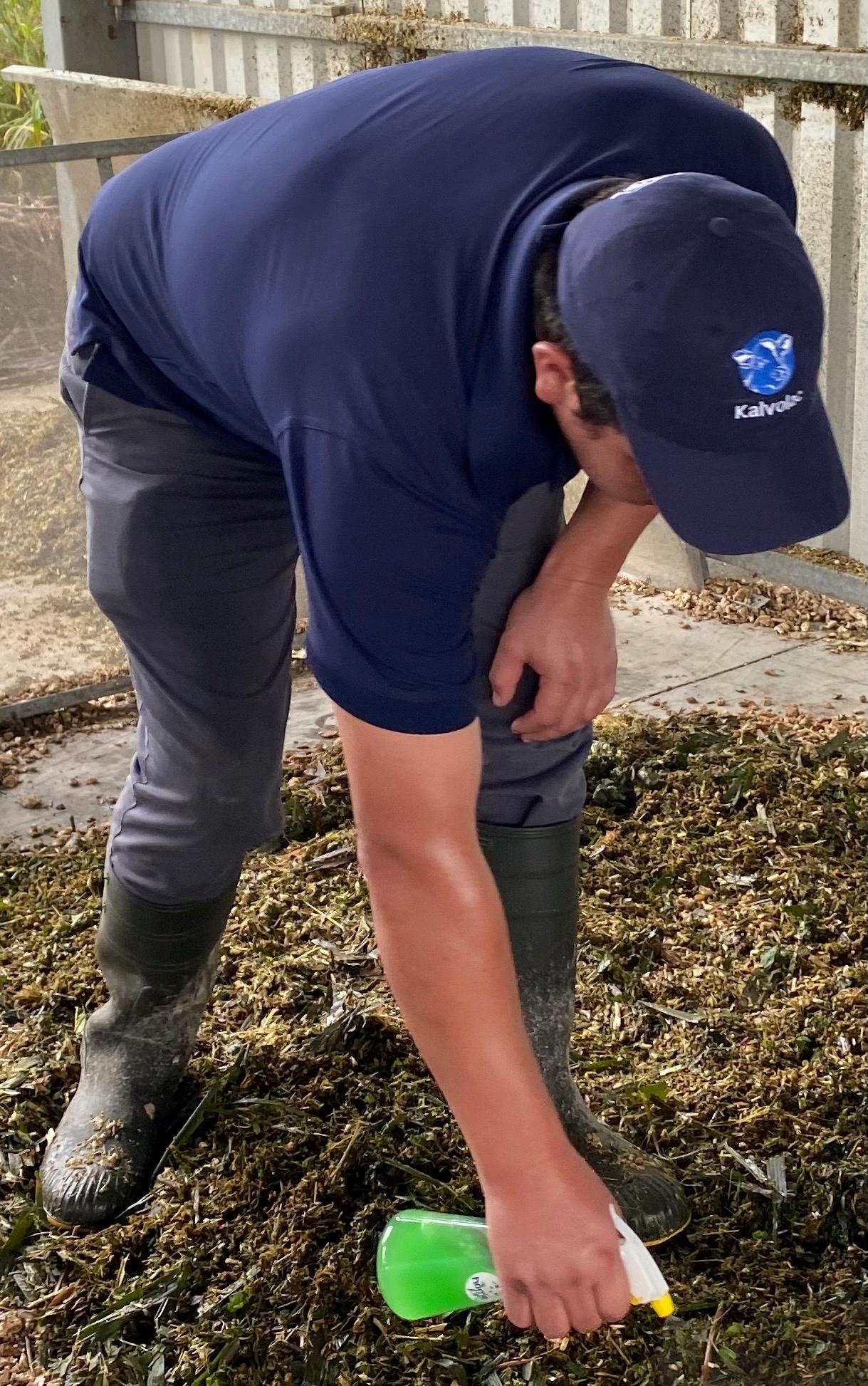 1) MUESTRA ENSILAJE. Se tomo 1 gr de ensilaje y se macero. Se agito en un envase con 50cc de agua destilada. Se tomo una submuestra de 2cc con la micro-cubeta. Se le aplico reactivo No 1 y luego se aplicó el reactivo No 2, la mezcla se agito por 30‘’ y luego se dejó en reposo por 10‘, al retiro de las dos tiritas con ambos reactivos. El líquido fue tomando coloración celeste. El indicador ubico el color en la 2ª casetilla de 0,05 ppm.