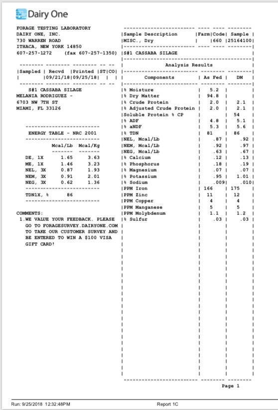 Análisis contenido de HCN en ensilaje de yuca de 75 días de elaborado y en leche de vaca 988, el 7º día de consumo de 9 kg/v/d. Cálculo del contenido de HCN – Lectura del KIT 0,05 X 0,05 constante = 0,0025 ppm en un gr de ensilaje. Si los sólidos totales de la leche son en promedio 12 %, la concentración de HCN = 0,0025/0,12 = 0,021 ppm