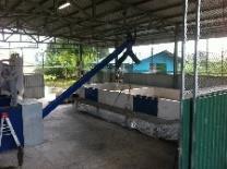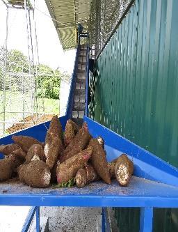 EL SISTEMA UTILIZADO TIENE UN RECIBIDOR DE TOLVA (para manejo de la yuca y eliminación de pezones y reducción de tamaño de raices muy grandes que pueden trabar picadora en la línea de producción), Y UNA BANDA TRANSPORTADORA QUE SUBE LA YUCA PARA LAVADO