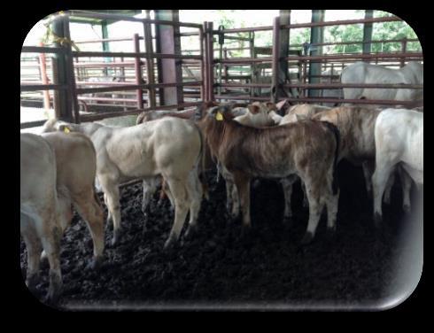 Considerando que no iba a ser posible poder realizar el estudio de alimentación adecuadamente por las limitaciones mencionadas anteriormente, que terminaron con apenas 49 días para fase de adaptación y fase experimental, se continúa según lo planeado pues la prueba de calidad si debe seguir adelante. Finalmente los animales pudieron ser trasladados de Guápiles a Cañas, el 14 de febrero del 2017. Se envian 16 animales, 4 de cada uno de los perfiles genéticos F1: Angus Rojo, Charolais, Brangus y Brahman puros comerciales. Por error se envió un animal Charolais confundido en el grupo A. Rojo, quedando los grupos conformados finalmente, por 3, 5, 4 y 4 animales respectivamente. También se debe indicar que todos los animales escogidos fueron machos, sin embargo, en el caso del F1 Brangus x Brahman solo se dispuso de uno, conformado el grupo por 3 hembras y un macho. En el análisis de las pruebas de calidad se tomaría en cuenta dicha condición. Al día siguiente los animales fueron pesados, se desparasitaron y se distribuyeron al azar en los corrales individuales, a excepción de los animales Brangus que fueron a corral común a cielo abierto, y se sometieron a dos semanas de ajuste al consumo en confinamiento de harina yuca (HYtransportada oportunamente desde EELD), botón de Oro picado (BO), heno de transvala de calidad y sales minerales. Posteriormente en cantidades ajustables cada tres días consumieron mezcla de 1 kg HY+ 2 kg BO y 300 gr minelaza. Este periodo de acostumbramiento duró 14 días.