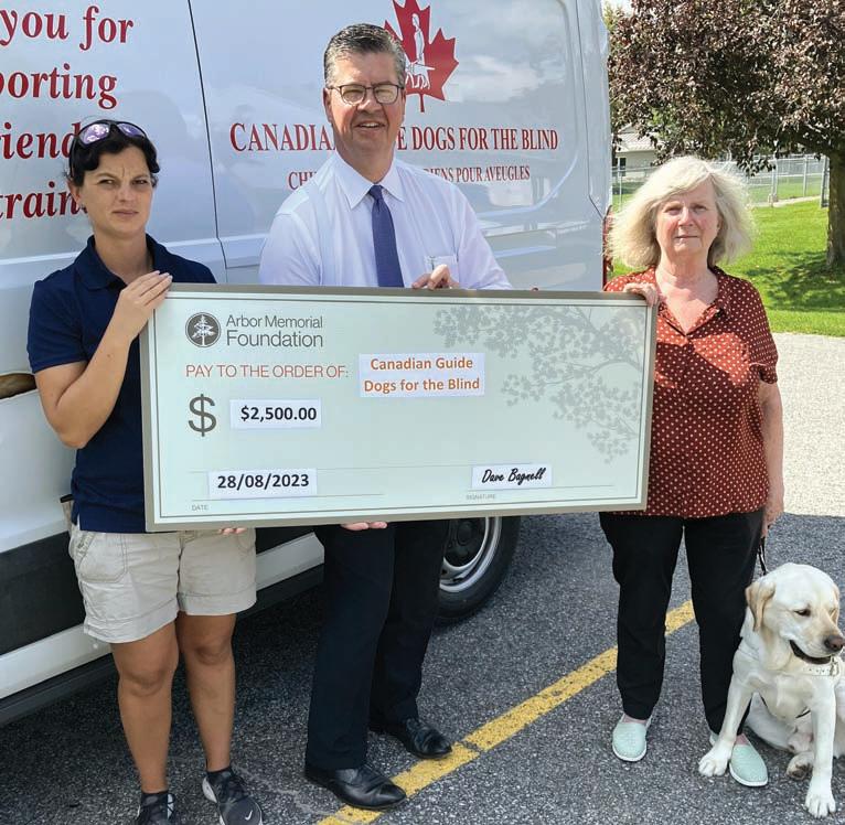 David Bagnell, Funeral Director with Capital Funeral Home & Cemetery on Prince of Wales Drive, presented a $2500 cheque to Canadian Guide Dogs for the Blind in Manotick last week. Capital Funeral Home & Cemetery is a member of Arbor Memorial Services which has a charitable foundation under the name of the Arbor Memorial Foundation (AMF). “Each year all Arbor employees are asked to submit requests for many assorted charitable organizations in the communities we all live and work in, and this year I chose Canadian Guide Dogs for the Blind,” stated Bagnell. “The AMF approved my request.”