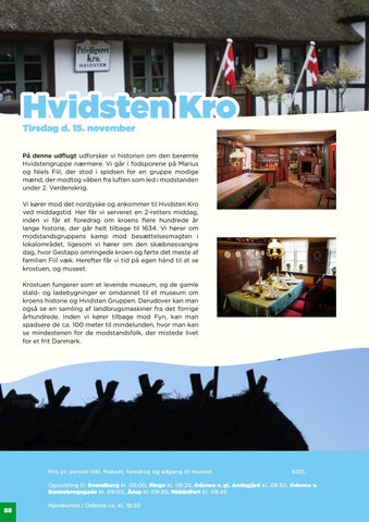 På denne udflugt udforsker vi historien om den berømte Hvidstengruppe nærmere. Vi går i fodsporene på Marius og Niels Fiil, der stod i spidsen for en gruppe modige mænd, der modtog våben fra luften som led i modstanden under 2. Verdenskrig. Vi kører mod det nordjyske og ankommer til Hvidsten Kro ved middagstid. Her får vi serveret en 2-retters middag, inden vi får et foredrag om kroens flere hundrede år lange historie, der går helt tilbage til 1634. Vi hører om modstandsgruppens kamp mod besættelsesmagten i lokalområdet, ligesom vi hører om den skæbnesvangre dag, hvor Gestapo omringede kroen og førte det meste af familien Fiil væk. Herefter får vi tid på egen hånd til at se krostuen, og museet. Krostuen fungerer som et levende museum, og de gamle stald- og ladebygninger er omdannet til et museum om kroens historie og Hvidsten Gruppen. Derudover kan man også se en samling af landbrugsmaskiner fra det forrige århundrede. Inden vi kører tilbage mod Fyn, kan man spadsere de ca. 100 meter til mindelunden, hvor man kan se mindestenen for de modstandsfolk, der mistede livet for et frit Danmark.
