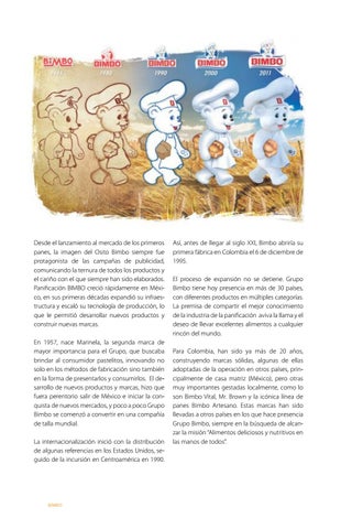 Así, antes de llegar al siglo XXI, Bimbo abriría su primera fábrica en Colombia el 6 de diciembre de 1995. El proceso de expansión no se detiene. Grupo Bimbo tiene hoy presencia en más de 30 países, con diferentes productos en múltiples categorías. La premisa de compartir el mejor conocimiento de la industria de la panificación aviva la llama y el deseo de llevar excelentes alimentos a cualquier rincón del mundo. Para Colombia, han sido ya más de 20 años, construyendo marcas sólidas, algunas de ellas adoptadas de la operación en otros países, principalmente de casa matriz (México), pero otras muy importantes gestadas localmente, como lo son Bimbo Vital, Mr. Brown y la icónica línea de panes Bimbo Artesano. Estas marcas han sido llevadas a otros países en los que hace presencia Grupo Bimbo, siempre en la búsqueda de alcanzar la misión “Alimentos deliciosos y nutritivos en las manos de todos”.