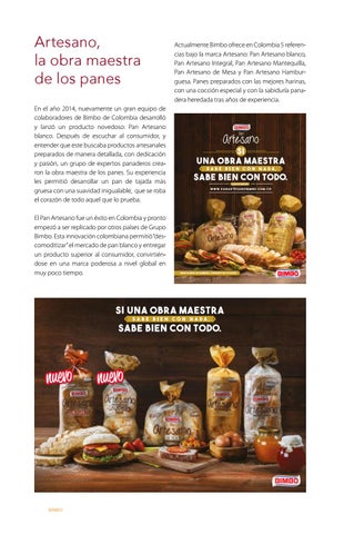 Artesano, la obra maestra de los panes En el año 2014, nuevamente un gran equipo de colaboradores de Bimbo de Colombia desarrolló y lanzó un producto novedoso: Pan Artesano blanco. Después de escuchar al consumidor, y entender que este buscaba productos artesanales preparados de manera detallada, con dedicación y pasión, un grupo de expertos panaderos crearon la obra maestra de los panes. Su experiencia les permitió desarrollar un pan de tajada más gruesa con una suavidad inigualable, que se roba el corazón de todo aquel que lo prueba. El Pan Artesano fue un éxito en Colombia y pronto empezó a ser replicado por otros países de Grupo Bimbo. Esta innovación colombiana permitió “descomoditizar” el mercado de pan blanco y entregar un producto superior al consumidor, convirtiéndose en una marca poderosa a nivel global en muy poco tiempo.