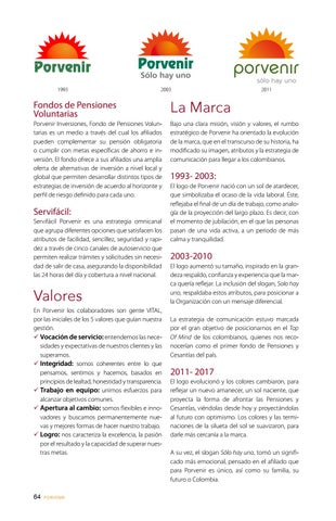 Bajo una clara misión, visión y valores, el rumbo estratégico de Porvenir ha orientado la evolución de la marca, que en el transcurso de su historia, ha modificado su imagen, atributos y la estrategia de comunicación para llegar a los colombianos.