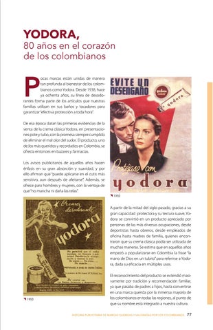 ocas marcas están unidas de manera tan profunda al bienestar de los colombianos como Yodora. Desde 1938, hace ya ochenta años, su línea de desodorantes forma parte de los artículos que nuestras familias utilizan en sus baños y tocadores para garantizar “efectiva protección a toda hora”. De esa época datan las primeras evidencias de la venta de la crema clásica Yodora, en presentaciones pote y tubo, con la promesa siempre cumplida de eliminar el mal olor del sudor. El producto, uno de los más queridos y recordados en Colombia, se ofrecía entonces en bazares y farmacias. Los avisos publicitarios de aquellos años hacen énfasis en su gran absorción y suavidad, y por ello afirman que “puede aplicarse en el cutis más sensitivo, aun después de afeitarse”. Además, se ofrece para hombres y mujeres, con la ventaja de que “no mancha ni daña las telas”. 1950