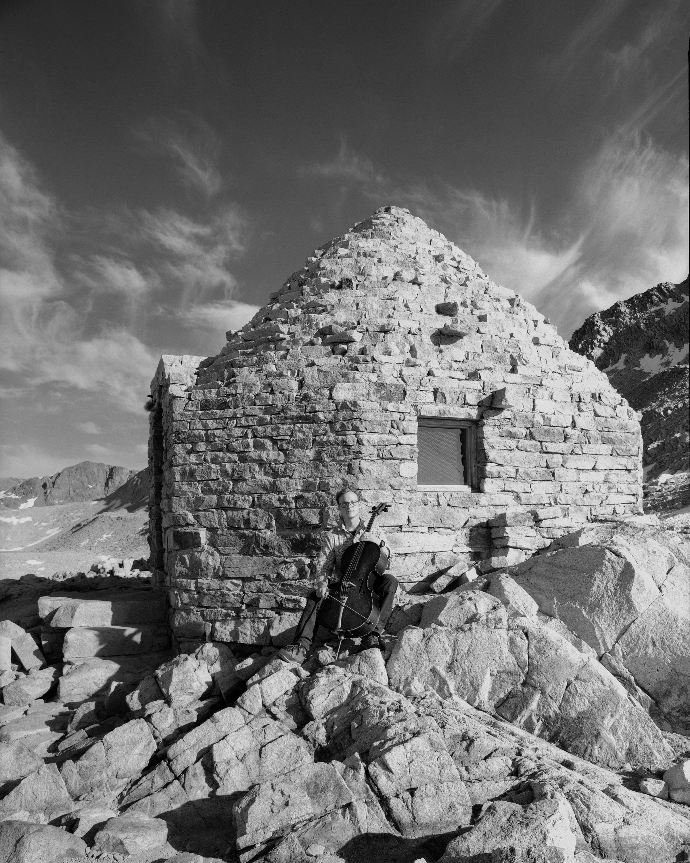 (Right) Ben Sollee & Cello at the Muir Shelter on Muir Pass, Kings Canyon National Park.