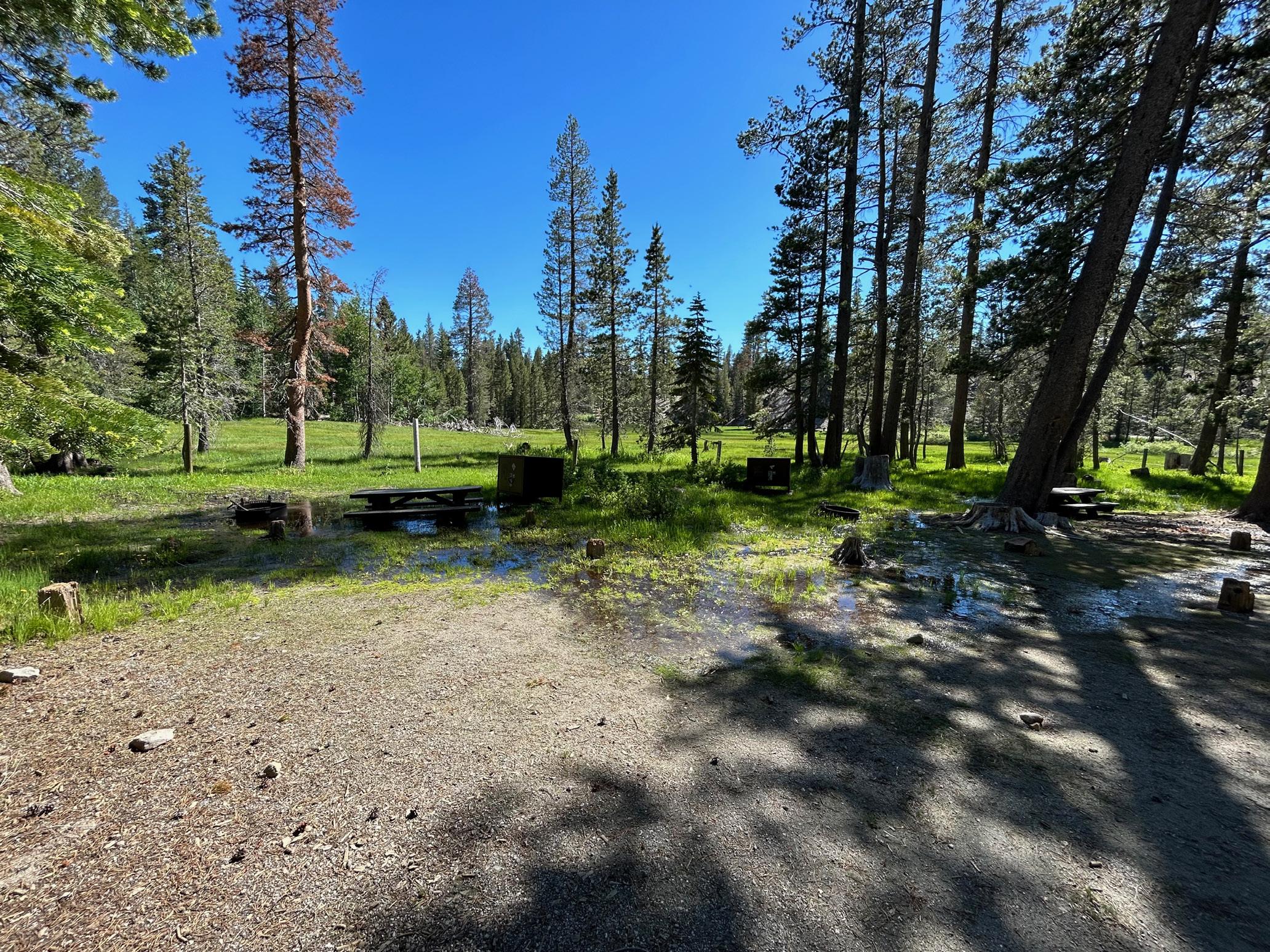 Flooded campsite in the meadow floodplain, Reds Meadow Campground
