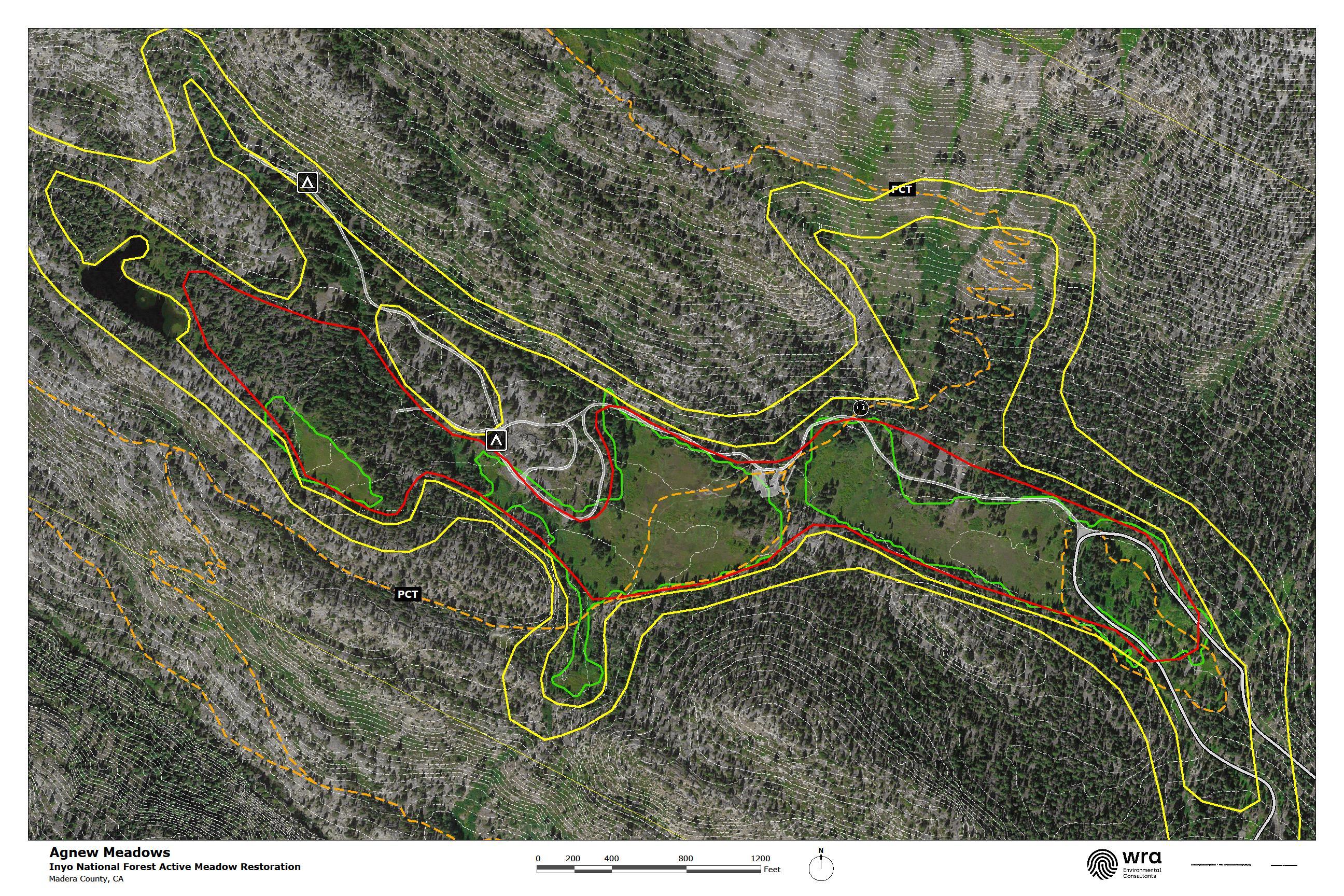 In addition, both meadows had a long history of stock grazing which had left a lasting impact on the sensitive habitats. Three site visits were conducted in June and July of 2024 to analyze specific details of the riparian corridor and campground designs, and to assess the condition of Agnew and Red Meadows.