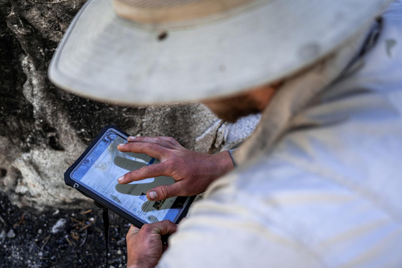 Field assessment team member at Reds Meadow working on a satellite-enabled iPad. September 2024