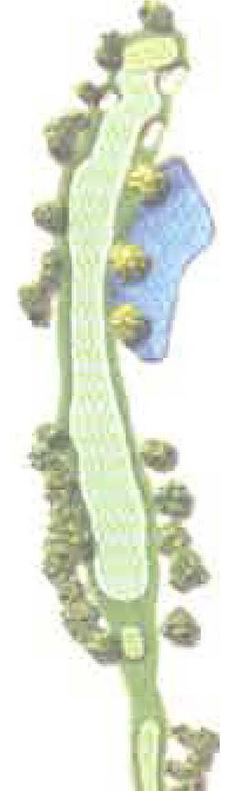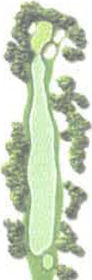 Any shot off the tee should favor the right half of the fairway. A well-placed approach leaves an uphill putt on this green, which is sloped heavily from right to left. Two greenside bunkers on the left are not visible from the fairway.