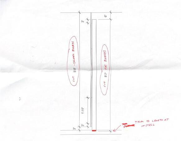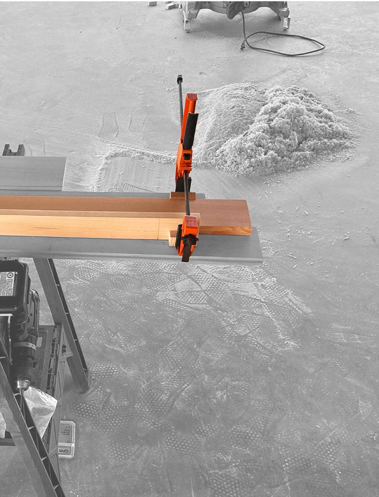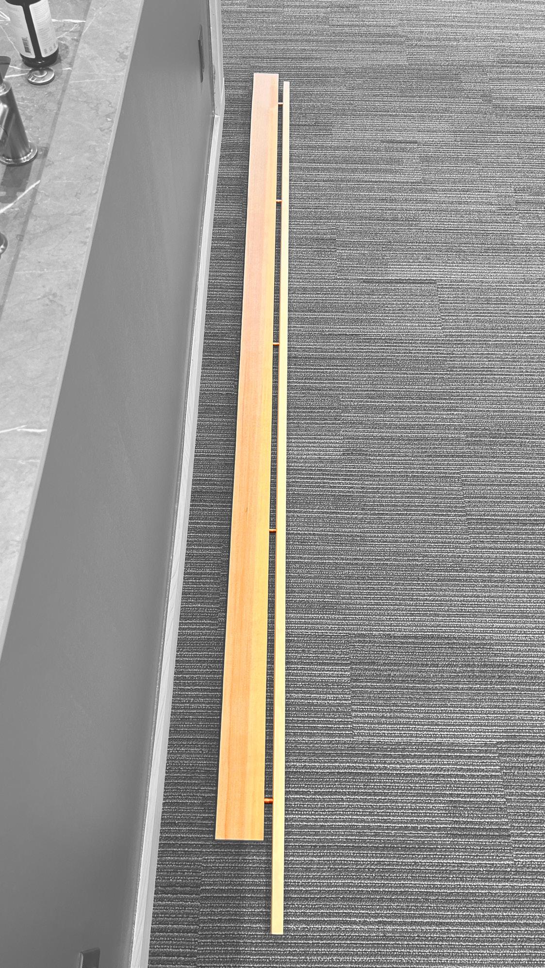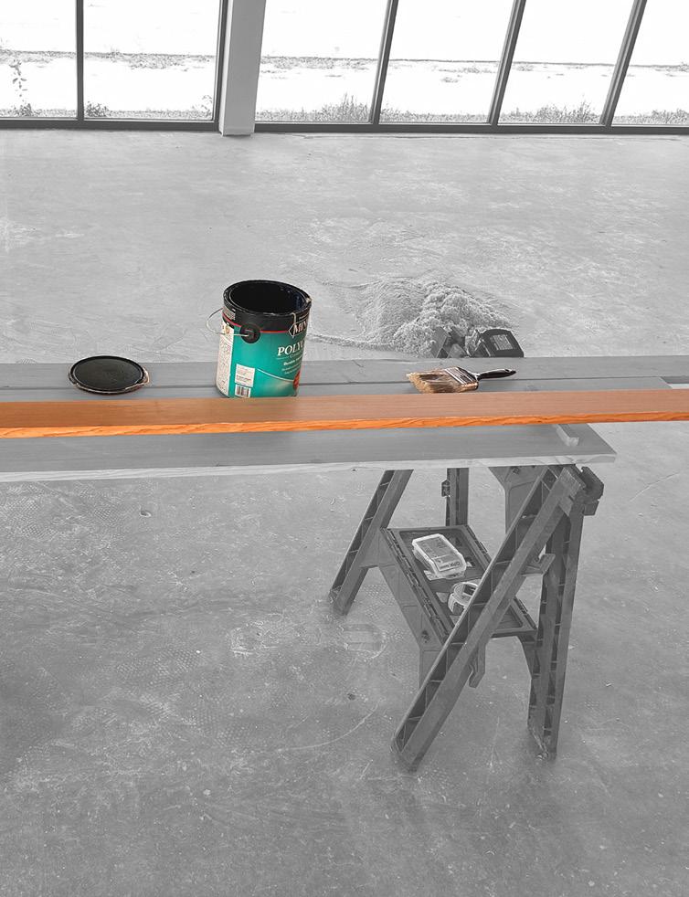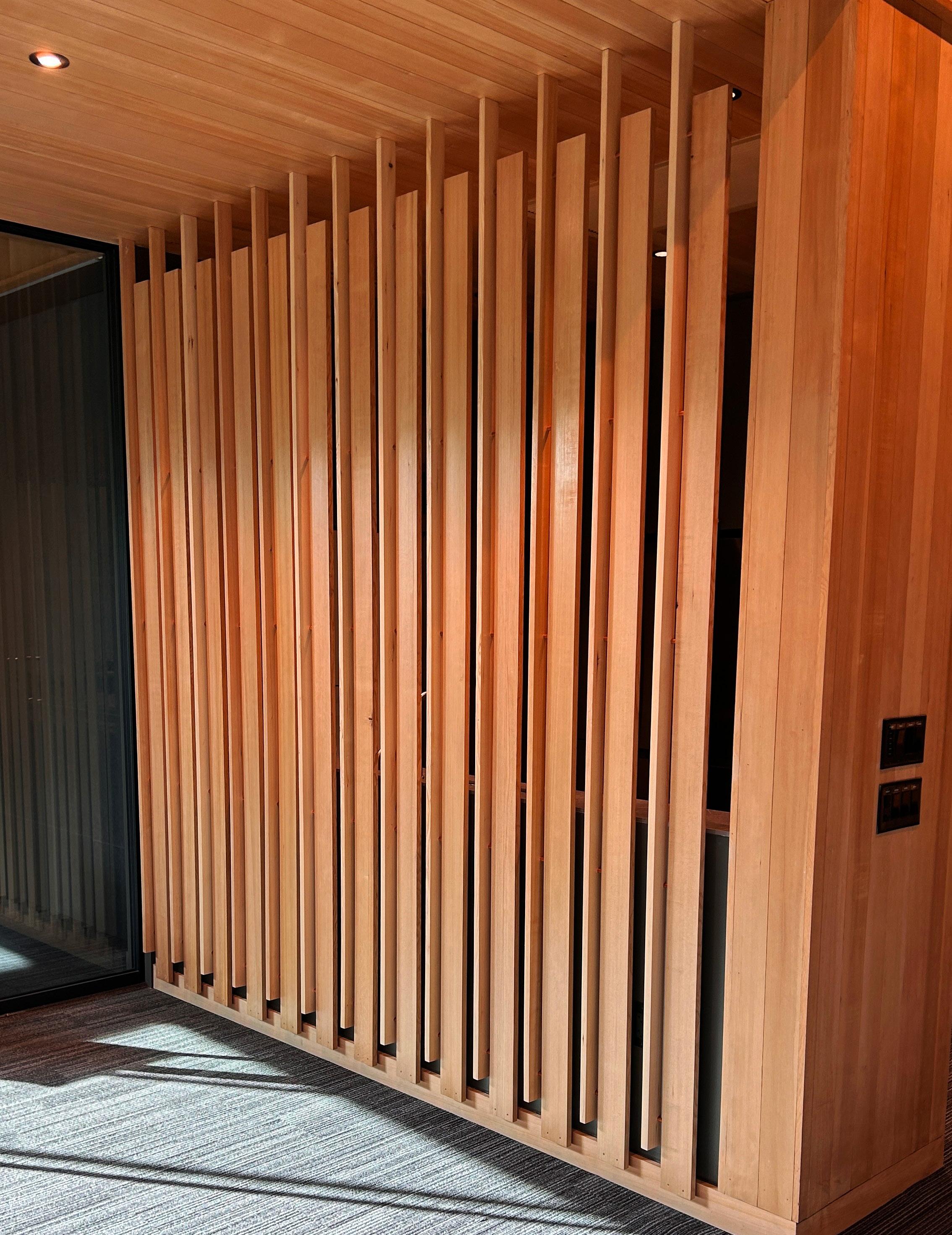 ALL OF THE CONSTRUCTION WAS COMPLETED IN THE ATTACHED VACANT RENTAL SPACE OF OUR OFFICE. I STARTED BY CUTTING DOWN THE TIMBER IN TWO SEPARATE DIMENSIONS. THE BOARDS WENT THROUGH A HAND-MILLING PROCESS TO ACHIEVE DESIRED DIMENSIONS. THEY WERE ALL SANDED BY HAND TO PREPARE FOR THE PAINTING PROCESS. THE PLANKS WERE PRE-DRILLED TO AVOID THE FUTURE POLYACRYLIC COAT FROM BEING TARNISHED. THE PROCESS OF PAINTING THE POLYACRYLIC COAT THEN LIGHT SANDING WAS REPEATED THREE TIMES TO ENSURE THE GRAIN OF THE TIMBER REALLY STANDS OUT. INSTALLATION REQUIRED THE USE OF MORE HANDS. WITH THE HELP OF RYAN, I MADE SURE EACH BOARD WAS PLUM AND ALIGNED TO THE ONES ON THE CEILING ALLOWING EITHER OF US TO HOLD IT IN PLACE BEFORE DRILLING IT INTO POSITION.