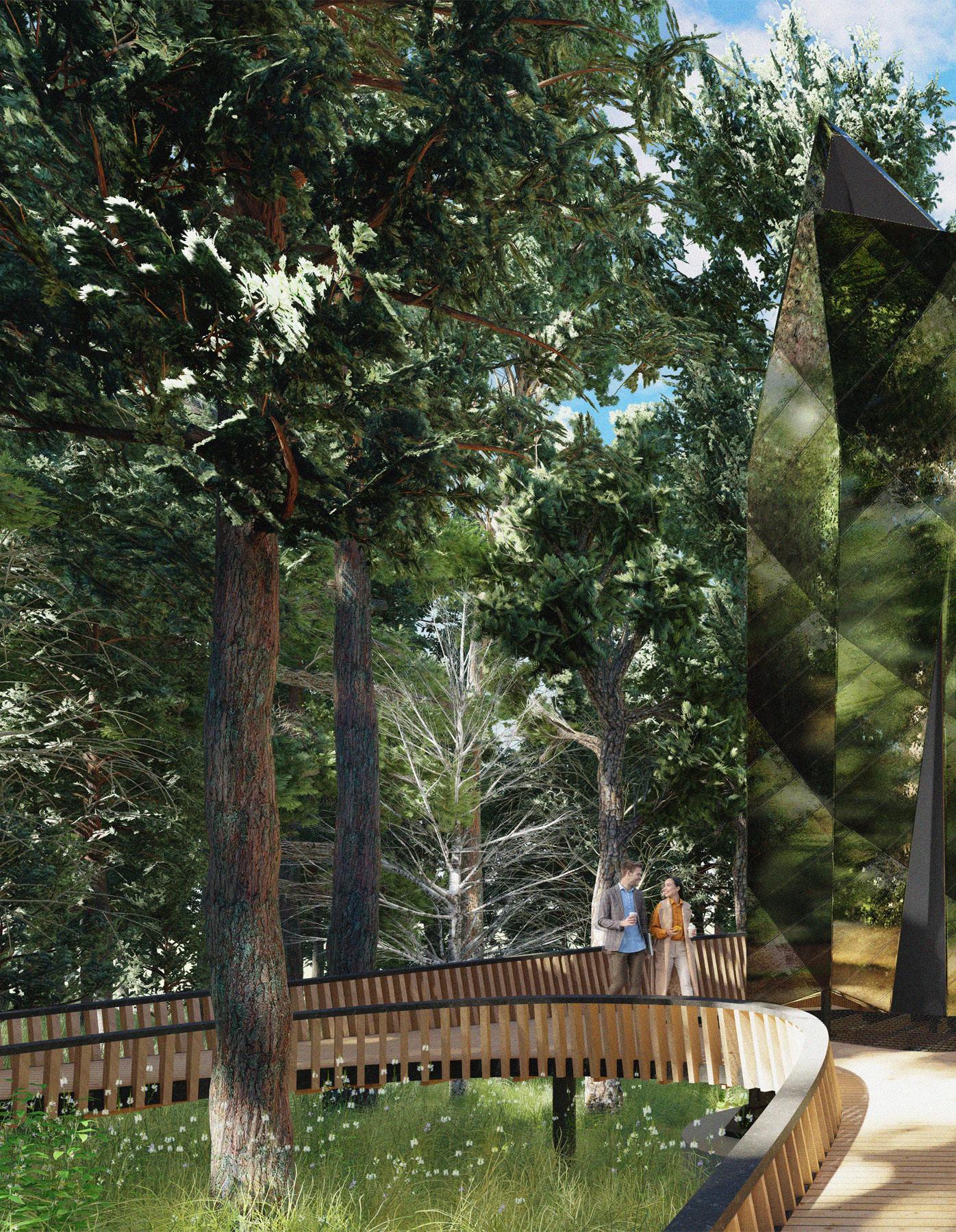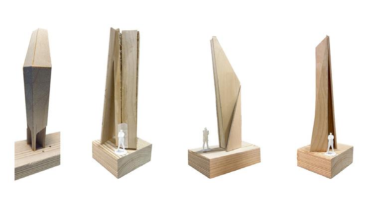 THE MOTTO OF THIS STUDIO PROJECT WAS IN THE FOREST, OF THE FOREST. EVERY DESIGN DICISION WAS INTENDED TO REPRESENT THE SUBLIME SENSORY EXPERIENCE OF THE FOREST WHILE PILOTING MATERIALS FOR THE WHIPPLE CENTER. THE TACTILE WORKS OF RICHARD SERRA BECAME OUR MAIN INSPIRATION. SERRA’S WORK PROVIDES AN EXPERIENCE THAT COMPELLS VEIWERS TO INTERACT WITH HIS PROJECTS AND IS A PRIME EXAMPLE OF THE EXPERIENCE THAT WE WERE TRYING TO CATER TO OUR VISITORS. WE STARTED WITH A DESIGN CHARRETTE THE BACK FROM OUR MID REVIEW THAT CALLED FOR A 1/8’’ SCALE MODEL TO REPRESENT THE FORM OF OUR NEW PROJECT. THE SMALL PLYWOOD MODELS WOULD REPRESENT A SMALL SPACE FOR AN INDIVIDUAL TO OCCUPY. THIS SMALL DESIGN COMPETITION DETERMINED THE FORM OF WHAT WOULD BE AN OBELISK IN A BOARDWALK WITHIN GARVAN WOODLAND GARDENS.