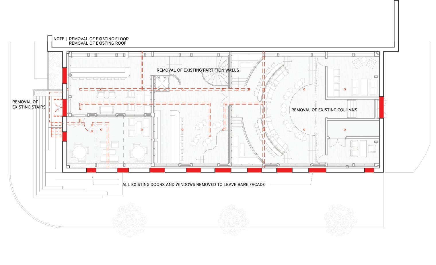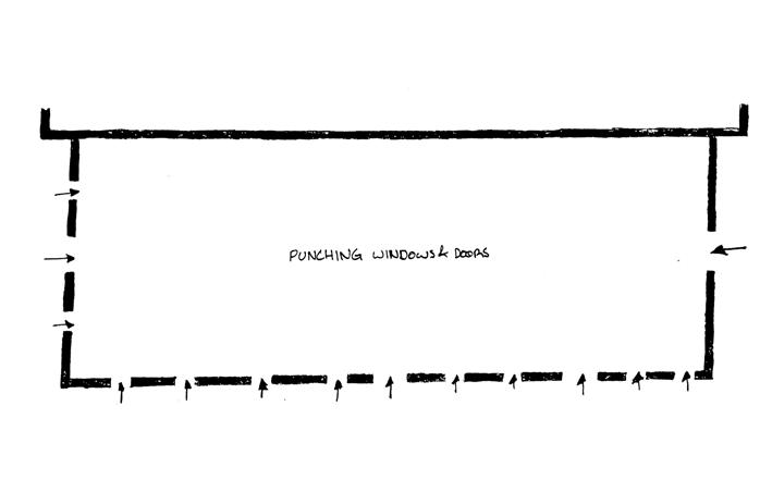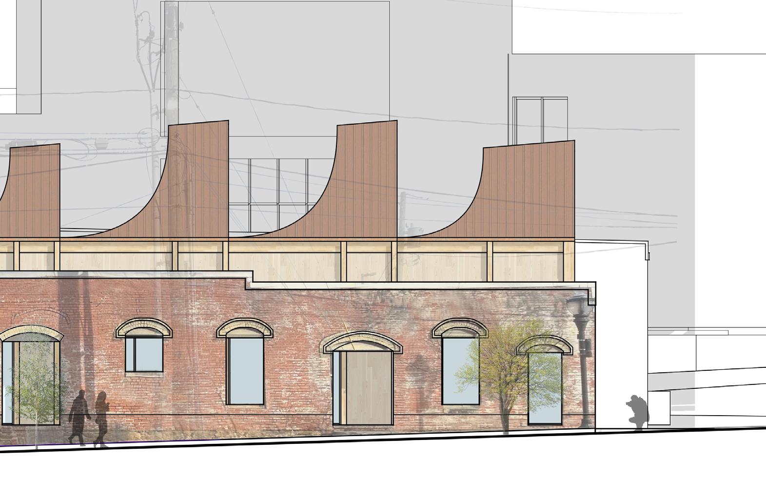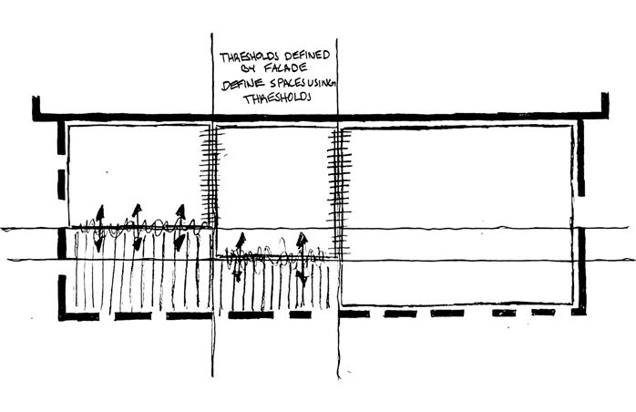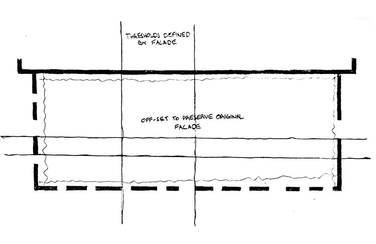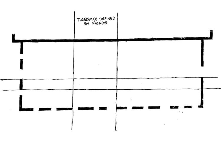 THE RIGHT SIDE OF THIS PAGE SHOWS THE EVOLUTION OF HOW THE SPACES WERE DETERMINED ON TRACE PAPER. THERE WAS AN INITIAL URGE TO RESPECT THE ORIGINAL FACADE AS IT IS AND LEAVE IT UNTOUCHED. THE WINDOWS AND DOORS WERE PUNCHED OUT LEAVING THE REST OF THE FACADE BARE AND UNTOUCHED. THRESHOLDS WERE CREATED FROM THESE OPENINGS IN THE FACADE. INSPIRED BY A PRECEDENT IN BROOKLYN, THE DOMINO SUGAR REFINERY, OFFSETS FROM THE ORIGINAL WALL RESPECT THE BUILDING’S FACADE. SPACES WERE DEFINED BY THE THRESHOLDS AND CELEBRATE THE PATINA OF THE ORIGINAL FACADE BY CREATING OPENINGS THAT SHOW THE OLD AND BEATEN BRICKWORK.