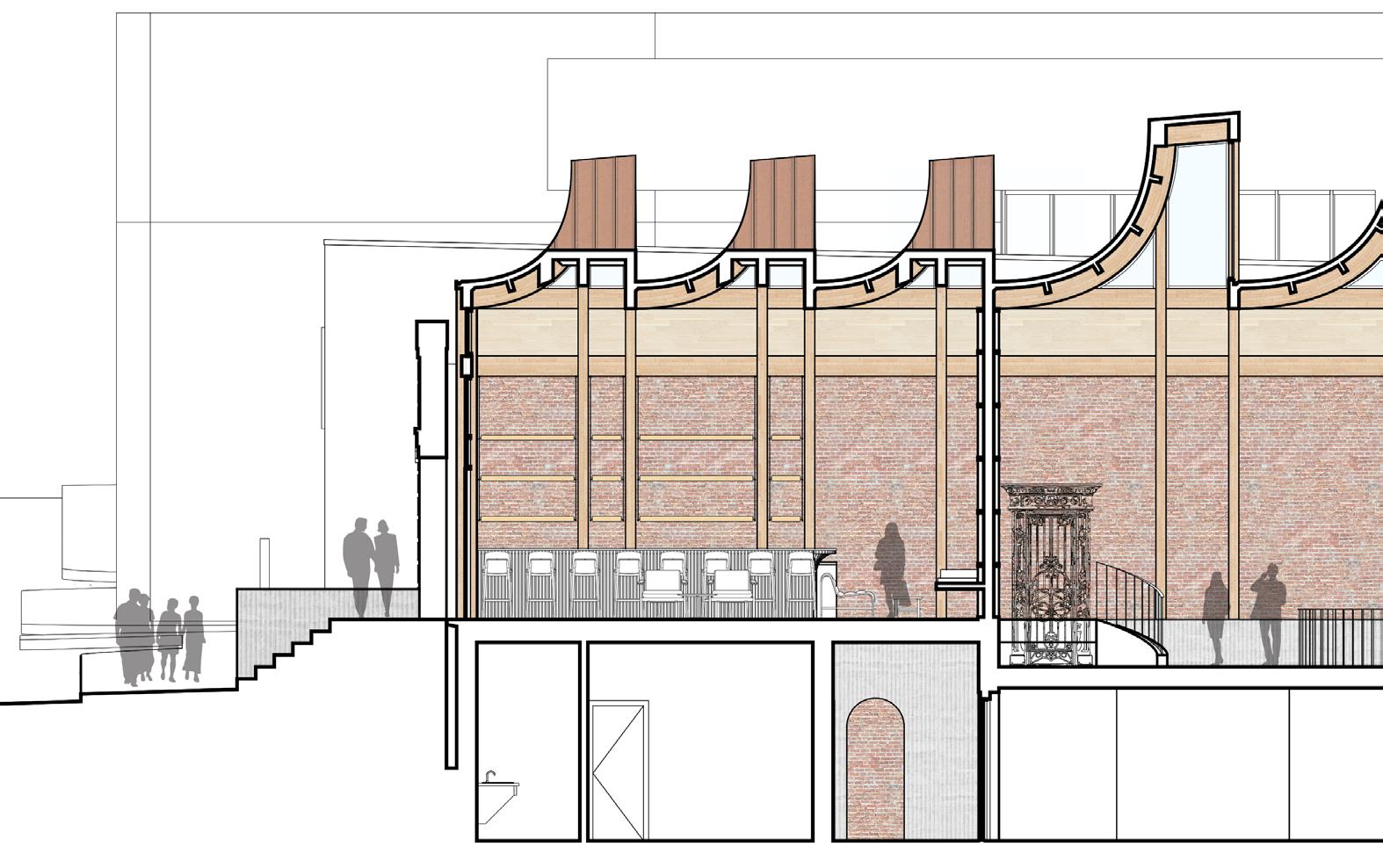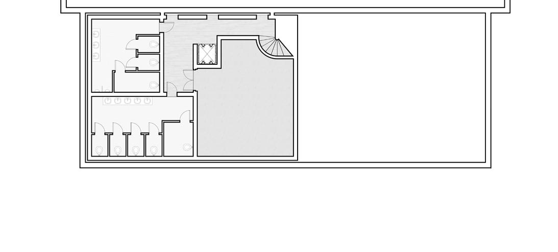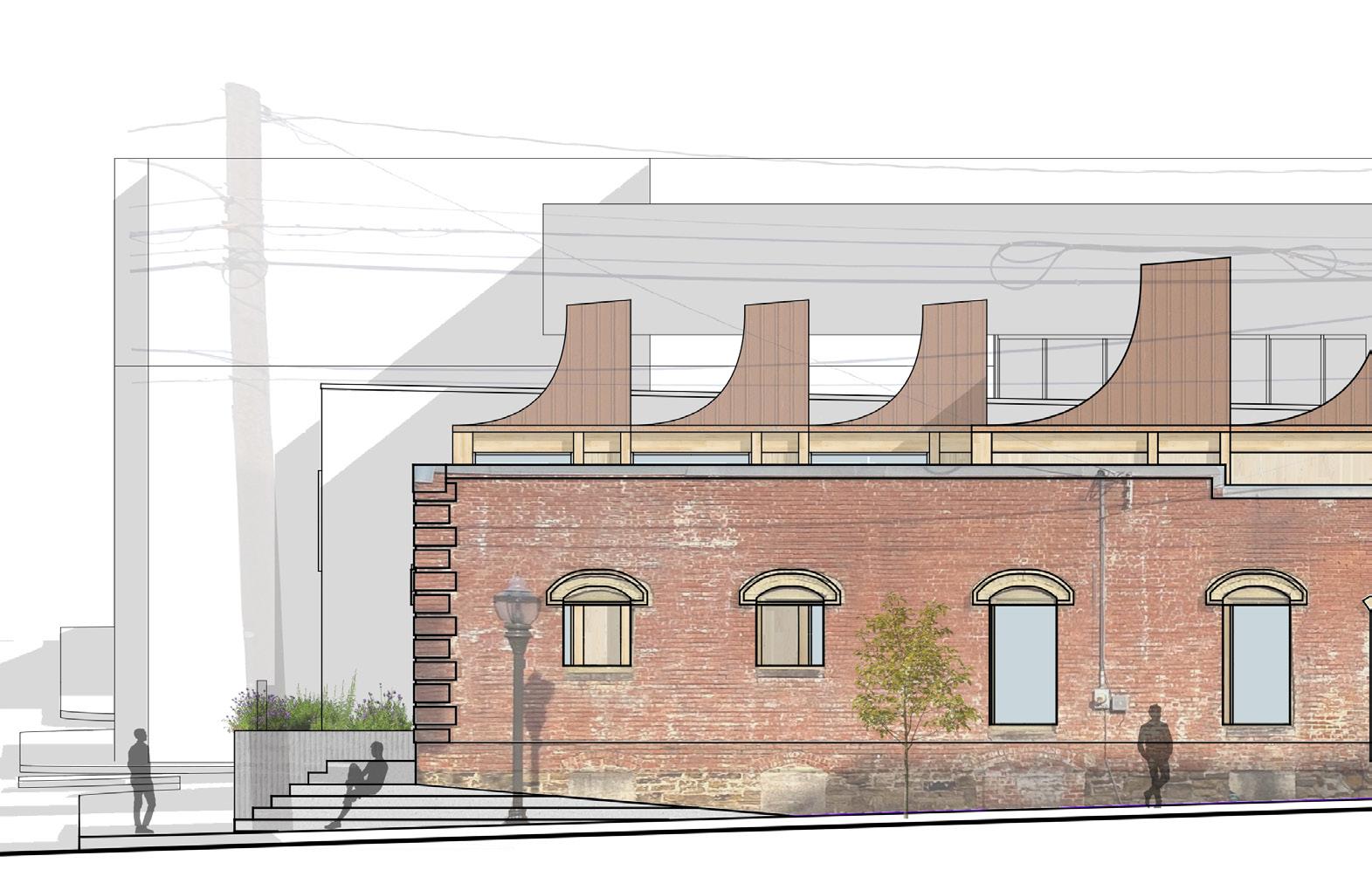 THE RIGHT SIDE OF THIS PAGE SHOWS THE EVOLUTION OF HOW THE SPACES WERE DETERMINED ON TRACE PAPER. THERE WAS AN INITIAL URGE TO RESPECT THE ORIGINAL FACADE AS IT IS AND LEAVE IT UNTOUCHED. THE WINDOWS AND DOORS WERE PUNCHED OUT LEAVING THE REST OF THE FACADE BARE AND UNTOUCHED. THRESHOLDS WERE CREATED FROM THESE OPENINGS IN THE FACADE. INSPIRED BY A PRECEDENT IN BROOKLYN, THE DOMINO SUGAR REFINERY, OFFSETS FROM THE ORIGINAL WALL RESPECT THE BUILDING’S FACADE. SPACES WERE DEFINED BY THE THRESHOLDS AND CELEBRATE THE PATINA OF THE ORIGINAL FACADE BY CREATING OPENINGS THAT SHOW THE OLD AND BEATEN BRICKWORK.