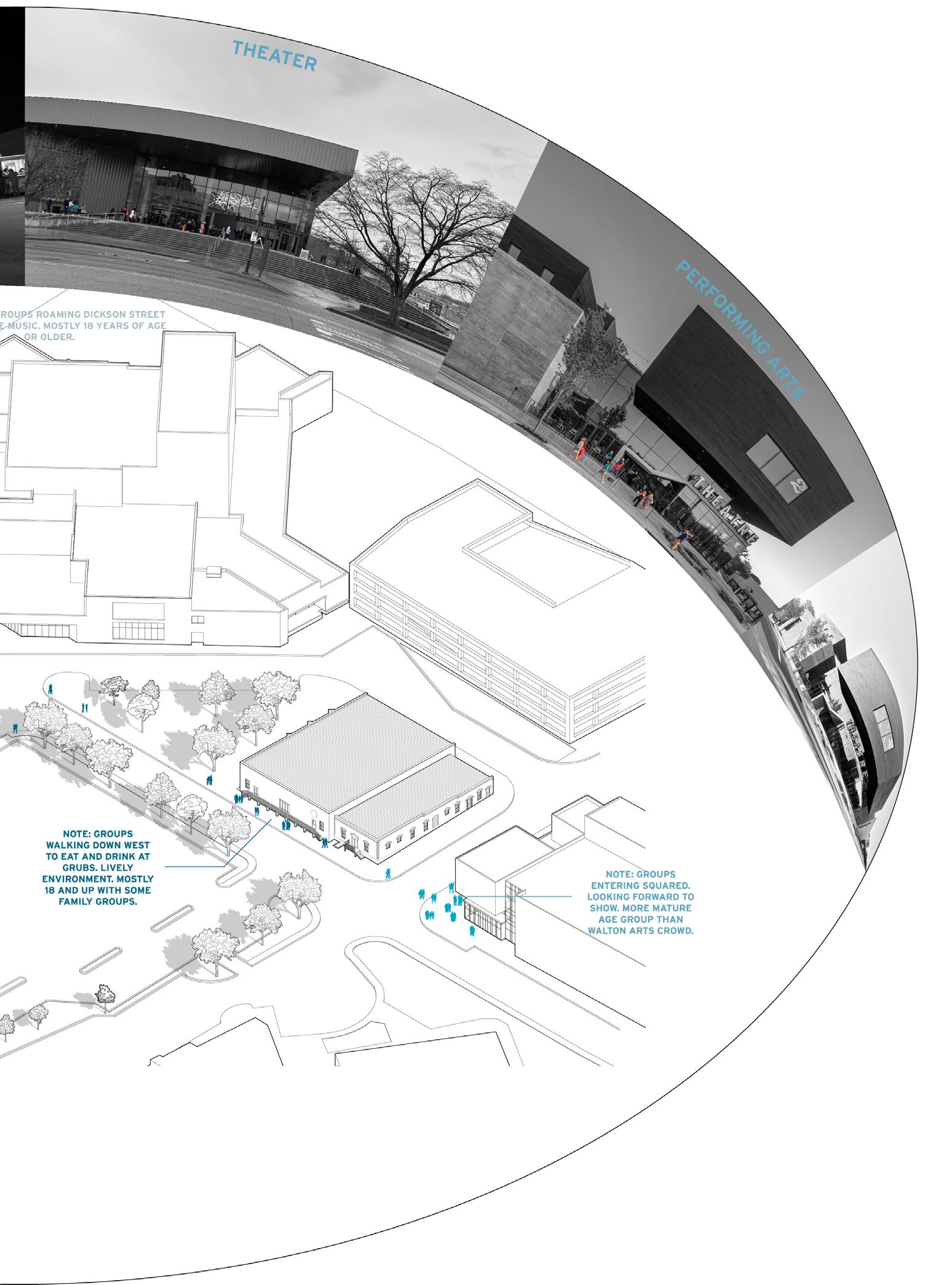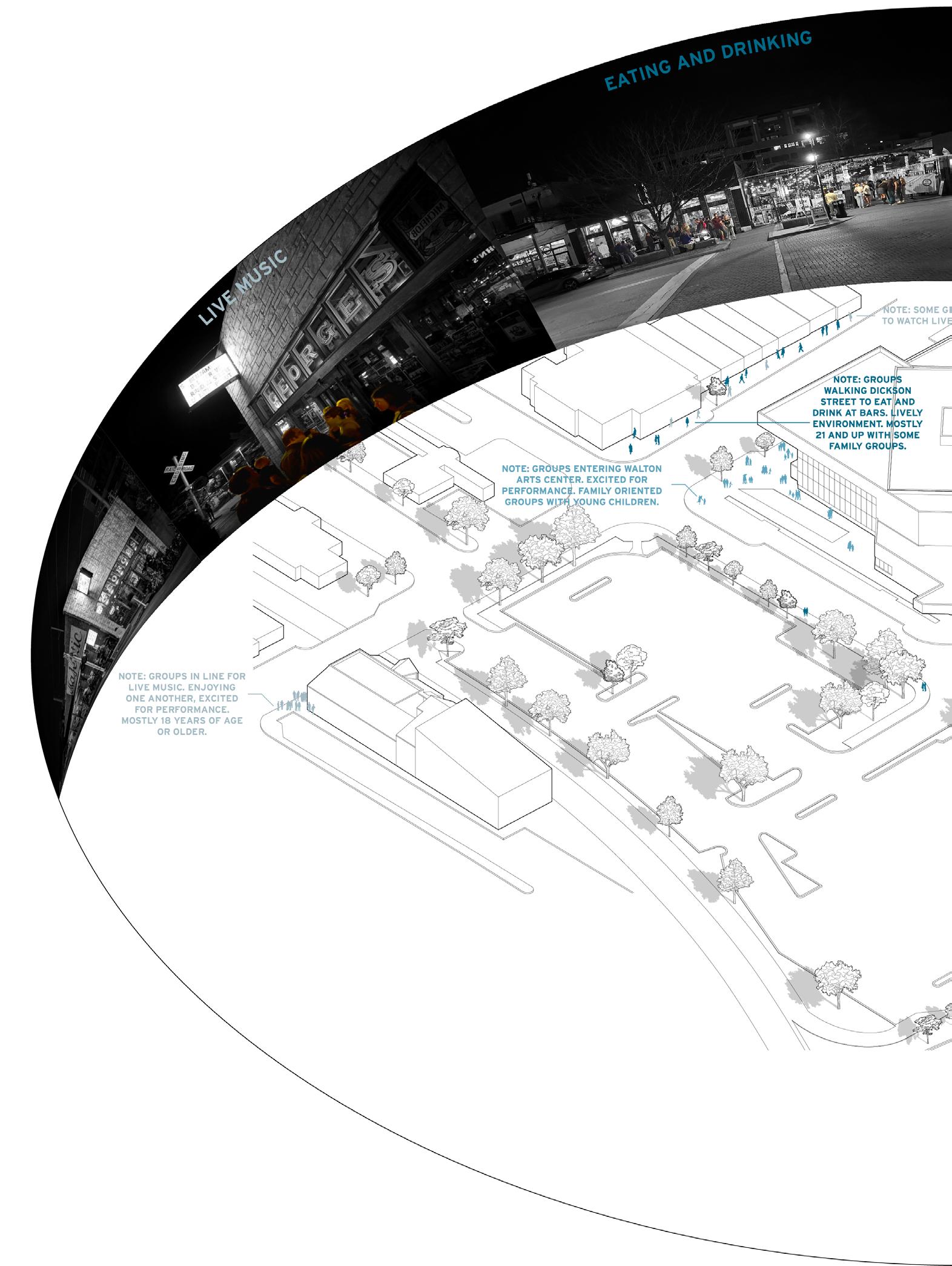 THE SITE ANALYSIS CREATED AN UNDERSTANDING THAT THERE IS SOMETHING MISSING FROM THE NIGHTLIFE IN THIS BAR DISTRICT OF FAYETTEVILLE. THERE WAS A NEED FOR A LIVE MUSIC VENUE THAT WOULD ENCOURAGE VISITORS TO DANCE TO THE MUSIC. THIS PROGRAM INTEGRATES LIVE JAZZ MUSIC AND A HYBRID PERFORMANCE SPACE FOR OTHER EVENTS TO CURATE AN EXPERIENCE THAT WOULD ENCOURAGE VISITORS TO GET UP TO DANCE AND LAUGH WITH FRIENDS OR FAMILY. BELOW ARE SOME INITIAL CONCEPT SKETCHES MADE ON SITE WHILE GATHERING DATA FOR THE SITE ANALYSIS.
