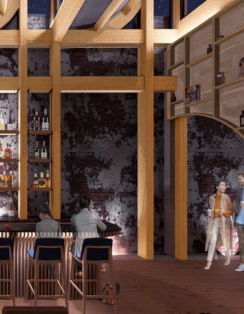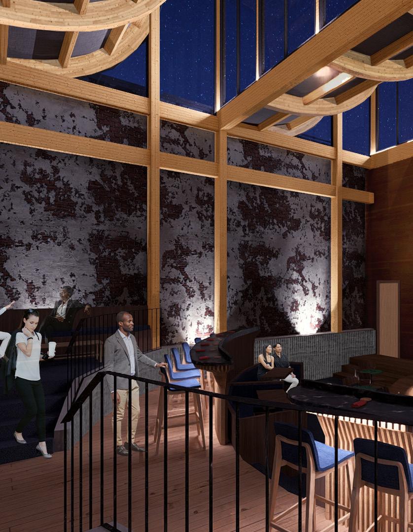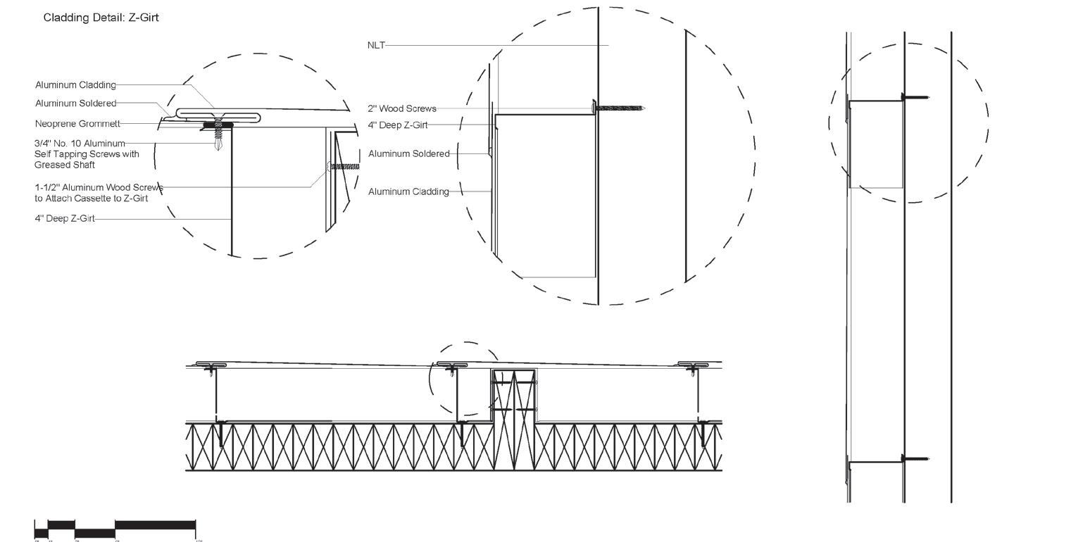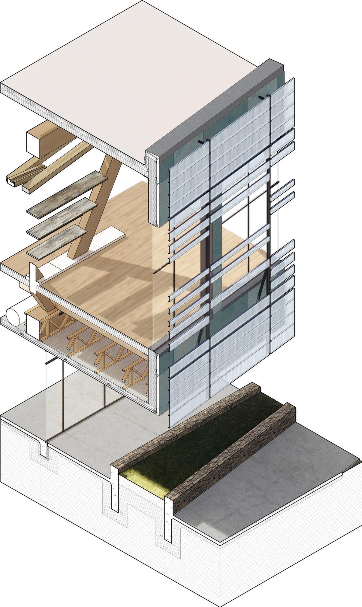 5’8” 13’ 4’ 8” 10’ 1st Floor Finish Floor Bottom of Truss Cord 2nd Floor Finish Floor Bottom of Top Truss Cord Ceiling Elevation Cistern Drain to Sanitary Sewer Pump Water Fountain Pump 1. Parapet Cap Flashing 2. Steel Facade 3. 1/4“ Opaque Glass Panels 4. 1/4” Galvanized Aluminum Supports 5. 1/4” Custom Aluminum Clips 6. 5 Ply CLT Wall 7. 5” Rigid Insulation 8. 4 “ Screws 9. Weather Membrane 10. 1/2” Sheathing 11. Steel Girt 12. Cut 2 x 4 13. Aluminum Sill 14. 1/2” Steel Fasteners 15. Tongue & Groove Decking 16. Aluminum Flashing 17. 1/2” Steel Connector 18. 1/4” Steel Plate Connector for CLT 19. Steel Bolt 20. 8” x 36” Glue Laminated Beam 21. So t Drip Edge 22. 2 x 4 Wood Connection 23. # 57 Rock 24. Polished Concrete Floor 25. 4” Drainage Pipe 26. Concrete Footing 27. ETPO Waterproof Membrane 28. 8” x 30” Glue Laminated Beam 29. 5 Ply CLT Roof 30. 7” Rigid Insulation 31. ETPO Waterproof Layer 32. Spray Foam Insulation 33. Typical Stud Wall 34. 18” x 24” Top Truss Chord 35. 9” x 1” Diagonal Truss Web 36. Blocking 37. HVAC Unit 38. 2 x 4 Light Truss 39. 18” x 24” Bottom Truss Chord 40. 24” x 24” Glue Laminated Column 41. 1/2” Steel Plate Connection 42. 2” Rigid Insulation 43. 8” Concrete Retaining Wall 44. Weather Membrane 45. Masonry Stone Wall 46. Reglet 1 2 3 4 5 14 6 7 10 11 8 12 9 16 13 18 19 20 15 21 22 17 23 25 24 35 34 39 26 31 30 29 28 40 42 41 27 45 44 46 43 38 32 33 37 36 SECTION DETAIL 37