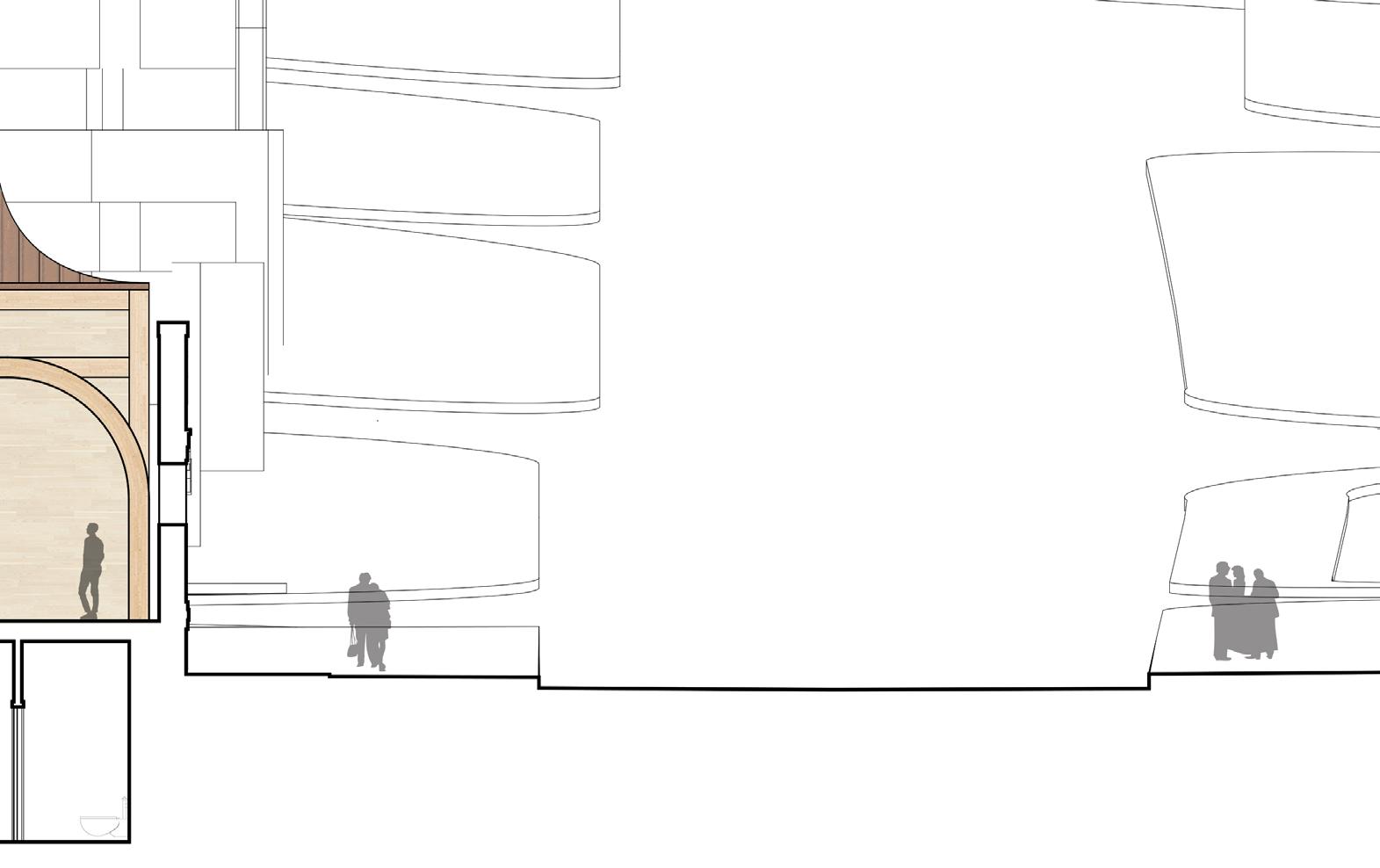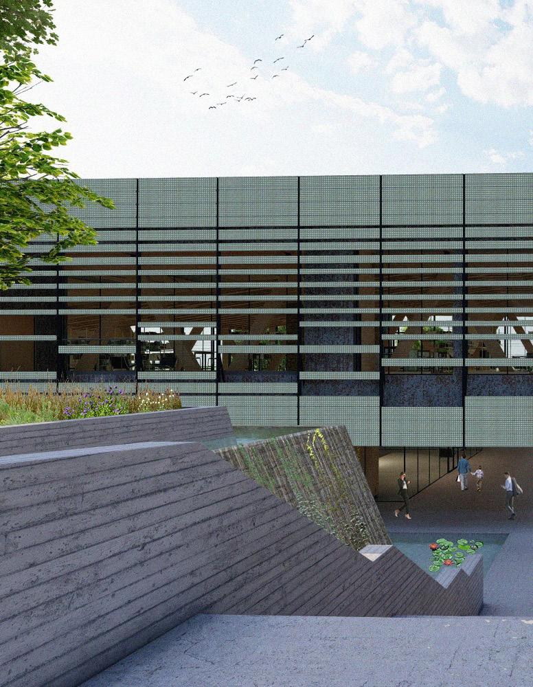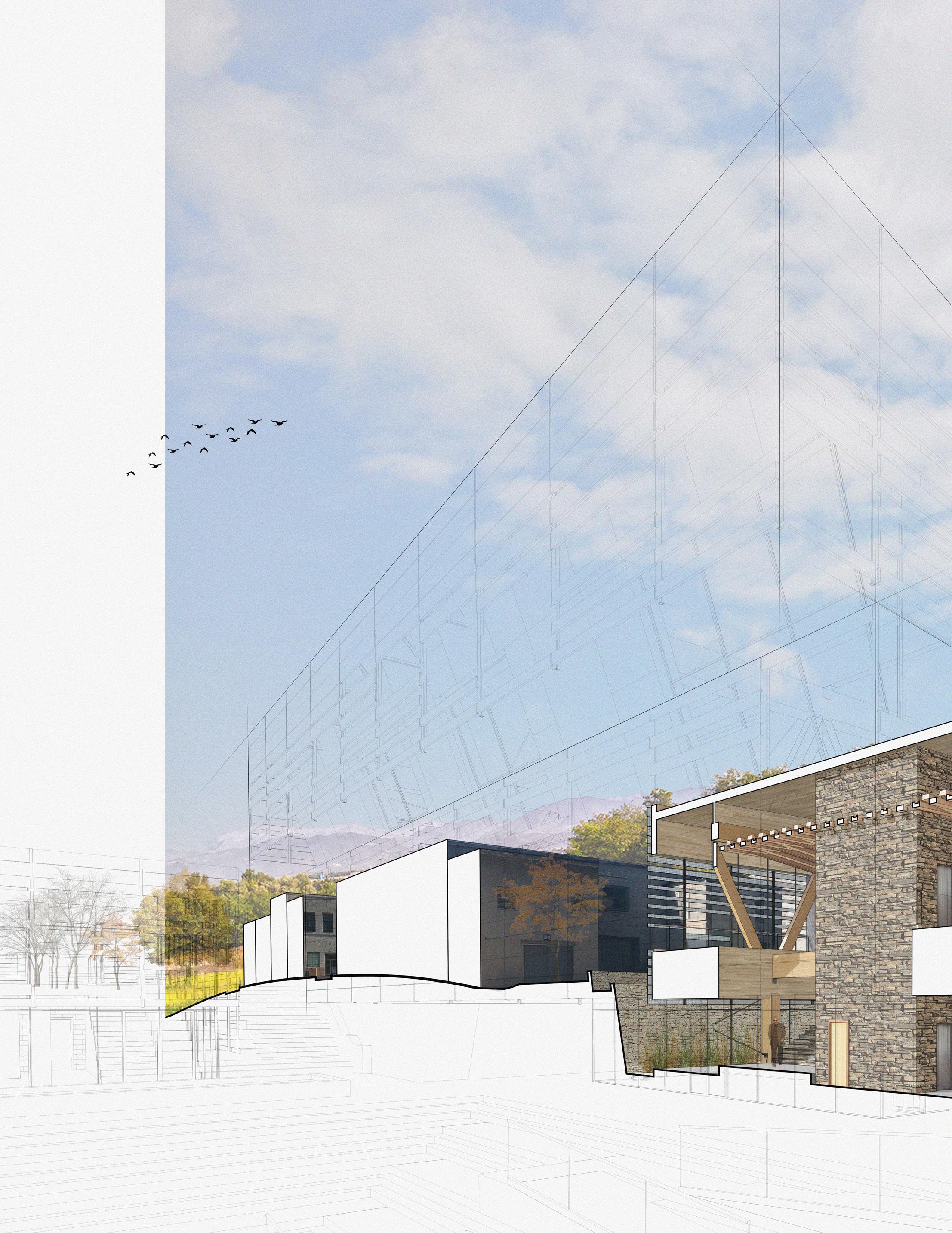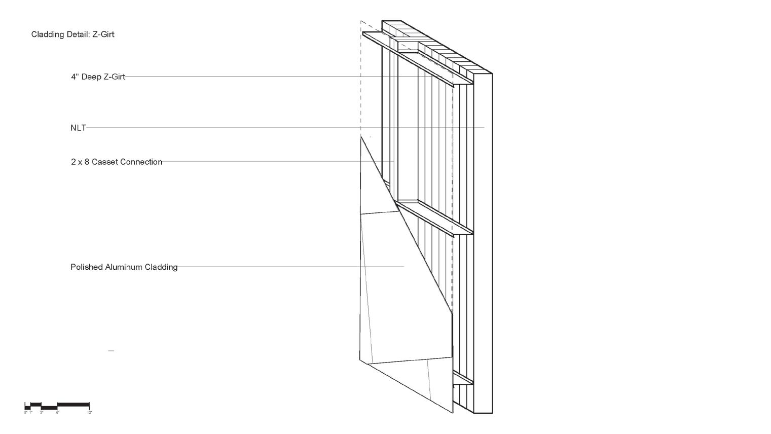 5’8” 13’ 4’ 8” 10’ 1st Floor Finish Floor Bottom of Truss Cord 2nd Floor Finish Floor Bottom of Top Truss Cord Ceiling Elevation Cistern Drain to Sanitary Sewer Pump Water Fountain Pump 1. Parapet Cap Flashing 2. Steel Facade 3. 1/4“ Opaque Glass Panels 4. 1/4” Galvanized Aluminum Supports 5. 1/4” Custom Aluminum Clips 6. 5 Ply CLT Wall 7. 5” Rigid Insulation 8. 4 “ Screws 9. Weather Membrane 10. 1/2” Sheathing 11. Steel Girt 12. Cut 2 x 4 13. Aluminum Sill 14. 1/2” Steel Fasteners 15. Tongue & Groove Decking 16. Aluminum Flashing 17. 1/2” Steel Connector 18. 1/4” Steel Plate Connector for CLT 19. Steel Bolt 20. 8” x 36” Glue Laminated Beam 21. So t Drip Edge 22. 2 x 4 Wood Connection 23. # 57 Rock 24. Polished Concrete Floor 25. 4” Drainage Pipe 26. Concrete Footing 27. ETPO Waterproof Membrane 28. 8” x 30” Glue Laminated Beam 29. 5 Ply CLT Roof 30. 7” Rigid Insulation 31. ETPO Waterproof Layer 32. Spray Foam Insulation 33. Typical Stud Wall 34. 18” x 24” Top Truss Chord 35. 9” x 1” Diagonal Truss Web 36. Blocking 37. HVAC Unit 38. 2 x 4 Light Truss 39. 18” x 24” Bottom Truss Chord 40. 24” x 24” Glue Laminated Column 41. 1/2” Steel Plate Connection 42. 2” Rigid Insulation 43. 8” Concrete Retaining Wall 44. Weather Membrane 45. Masonry Stone Wall 46. Reglet 1 2 3 4 5 14 6 7 10 11 8 12 9 16 13 18 19 20 15 21 22 17 23 25 24 35 34 39 26 31 30 29 28 40 42 41 27 45 44 46 43 38 32 33 37 36 SECTION DETAIL 37