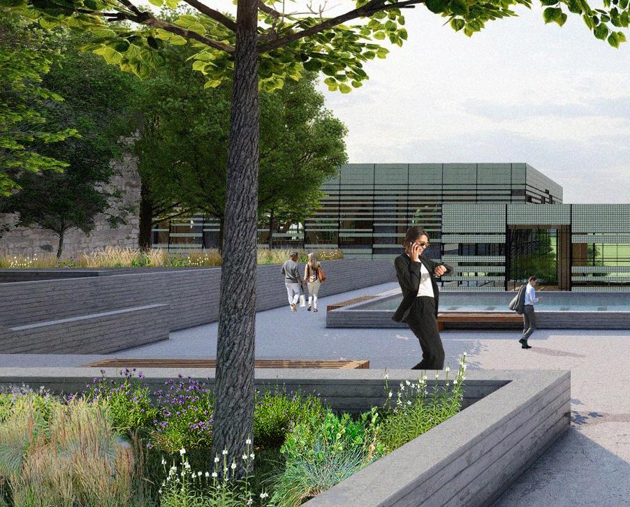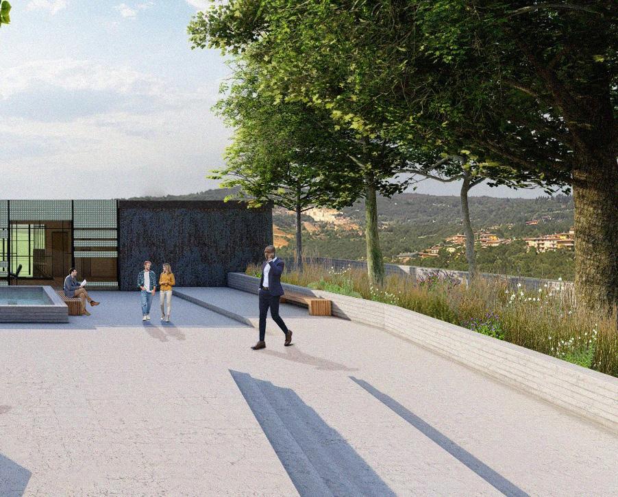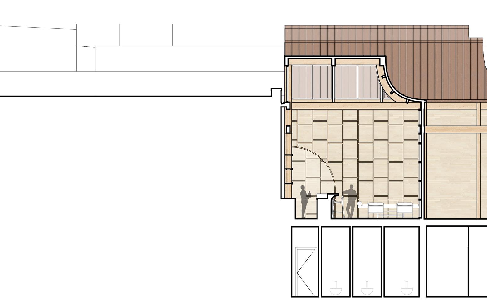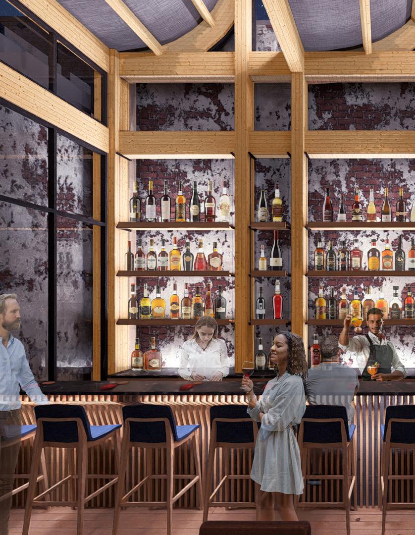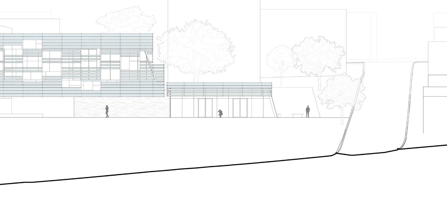 5’8” 13’ 4’ 8” 10’ 1st Floor Finish Floor Bottom of Truss Cord 2nd Floor Finish Floor Bottom of Top Truss Cord Ceiling Elevation Cistern Drain to Sanitary Sewer Pump Water Fountain Pump 1. Parapet Cap Flashing 2. Steel Facade 3. 1/4“ Opaque Glass Panels 4. 1/4” Galvanized Aluminum Supports 5. 1/4” Custom Aluminum Clips 6. 5 Ply CLT Wall 7. 5” Rigid Insulation 8. 4 “ Screws 9. Weather Membrane 10. 1/2” Sheathing 11. Steel Girt 12. Cut 2 x 4 13. Aluminum Sill 14. 1/2” Steel Fasteners 15. Tongue & Groove Decking 16. Aluminum Flashing 17. 1/2” Steel Connector 18. 1/4” Steel Plate Connector for CLT 19. Steel Bolt 20. 8” x 36” Glue Laminated Beam 21. So t Drip Edge 22. 2 x 4 Wood Connection 23. # 57 Rock 24. Polished Concrete Floor 25. 4” Drainage Pipe 26. Concrete Footing 27. ETPO Waterproof Membrane 28. 8” x 30” Glue Laminated Beam 29. 5 Ply CLT Roof 30. 7” Rigid Insulation 31. ETPO Waterproof Layer 32. Spray Foam Insulation 33. Typical Stud Wall 34. 18” x 24” Top Truss Chord 35. 9” x 1” Diagonal Truss Web 36. Blocking 37. HVAC Unit 38. 2 x 4 Light Truss 39. 18” x 24” Bottom Truss Chord 40. 24” x 24” Glue Laminated Column 41. 1/2” Steel Plate Connection 42. 2” Rigid Insulation 43. 8” Concrete Retaining Wall 44. Weather Membrane 45. Masonry Stone Wall 46. Reglet 1 2 3 4 5 14 6 7 10 11 8 12 9 16 13 18 19 20 15 21 22 17 23 25 24 35 34 39 26 31 30 29 28 40 42 41 27 45 44 46 43 38 32 33 37 36 SECTION DETAIL 37