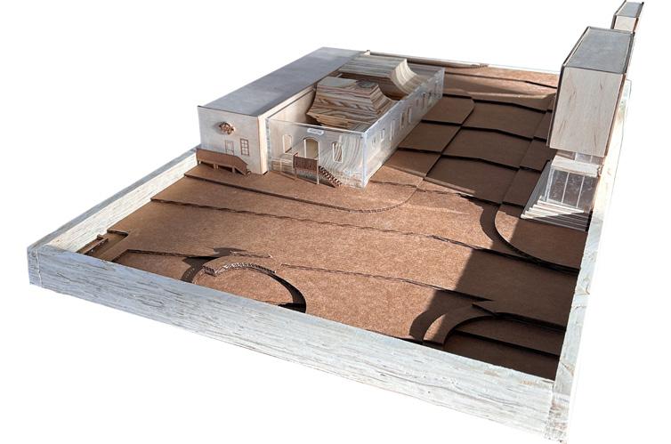THE MODEL IS AN ABSTRACT REPRESENTATION OF THIS STORY BY BEING SET BACK FROM THE ORIGINAL FACADE, RESPECTING THE PLANES OF THE FACADES LIKE THE POSTCARDS IN THE STORY. THE RAMP SHAPED FORM OF THE WOODEN BLOCKS REPRESENT THE NEW CITY WHICH IS UNRELATED TO THE ORIGINAL CITY, OR THE ORIGINAL GEOMETRIES OF THE FACADE. THE OPPOSING GEOMETRIES DO NOT RELATE TO EACHOTHER BUT COMPLIMENT EACH OTHER BY NOT INTERFERING WITH OR SHOWING DOMINANCE OVER EACH OTHER.