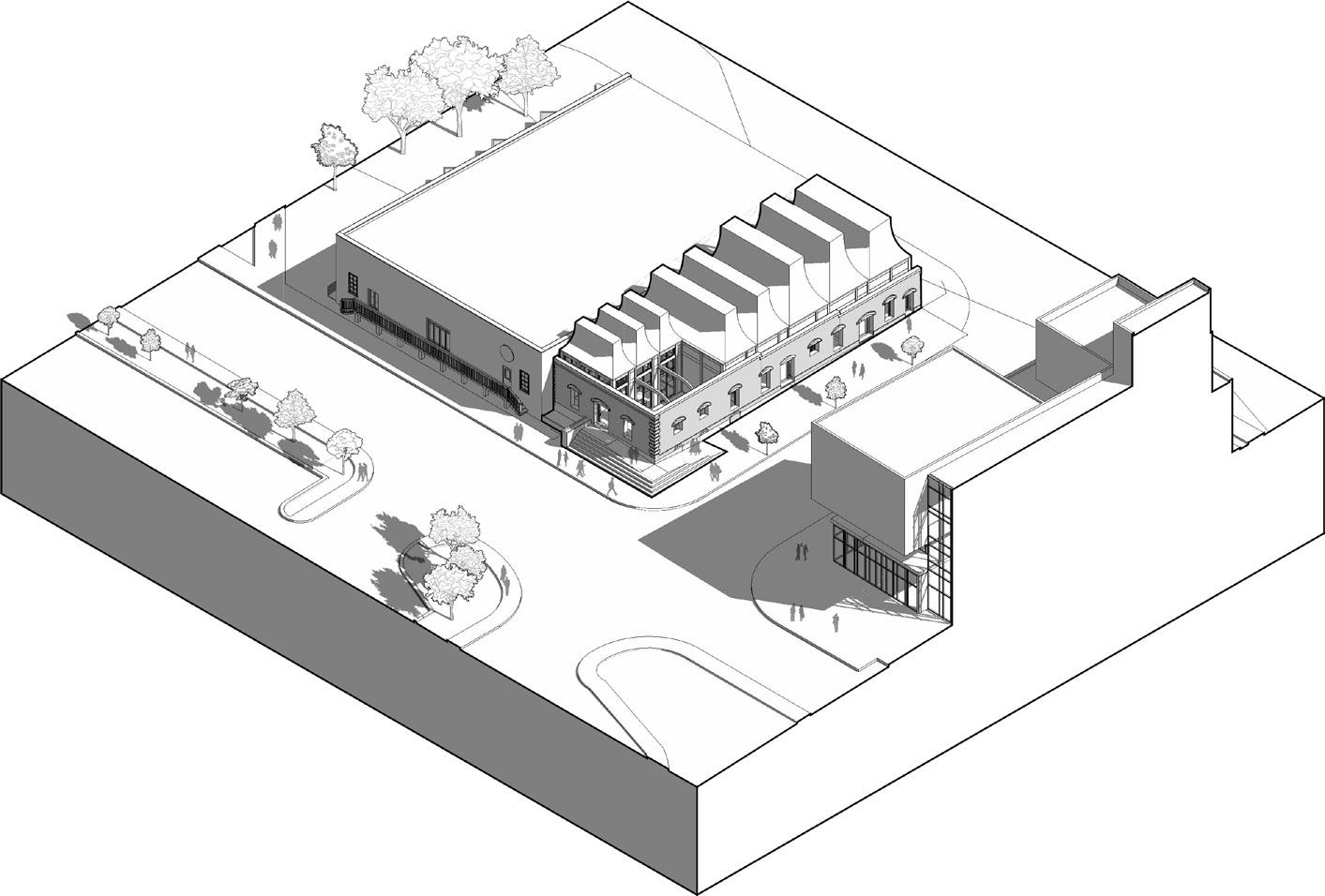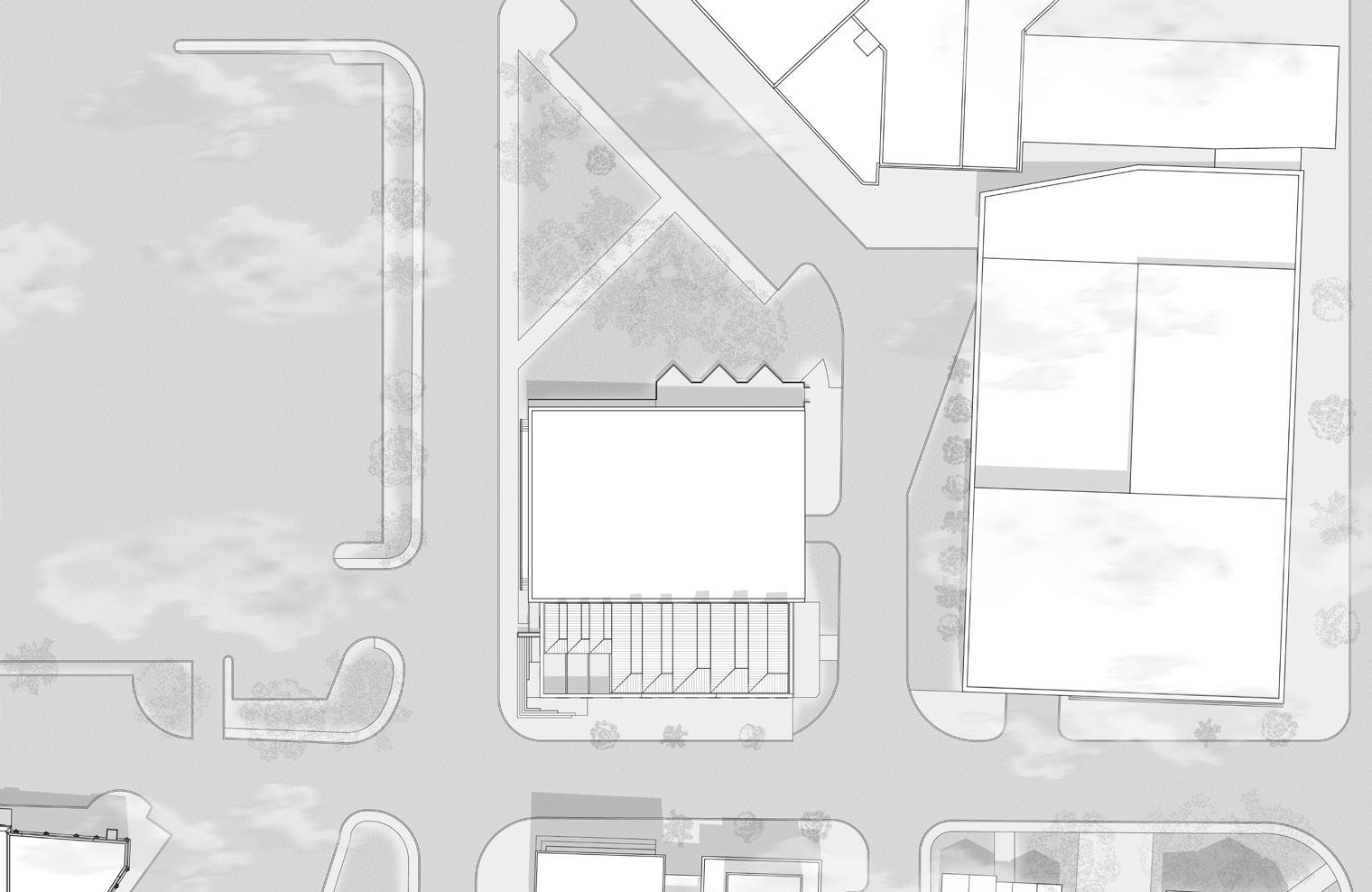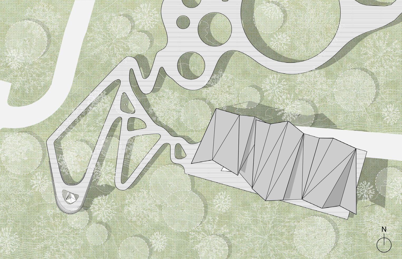 THESE GEOMETRIES CONTINUED INTO THE DEVELOPEMNT OF THE ROOF FORM. THE FORM BECAME A PLAY ON A SAWTOOTH ROOF AND IS INTENDED TO COMPLIMENT THE SPACES BELOW.