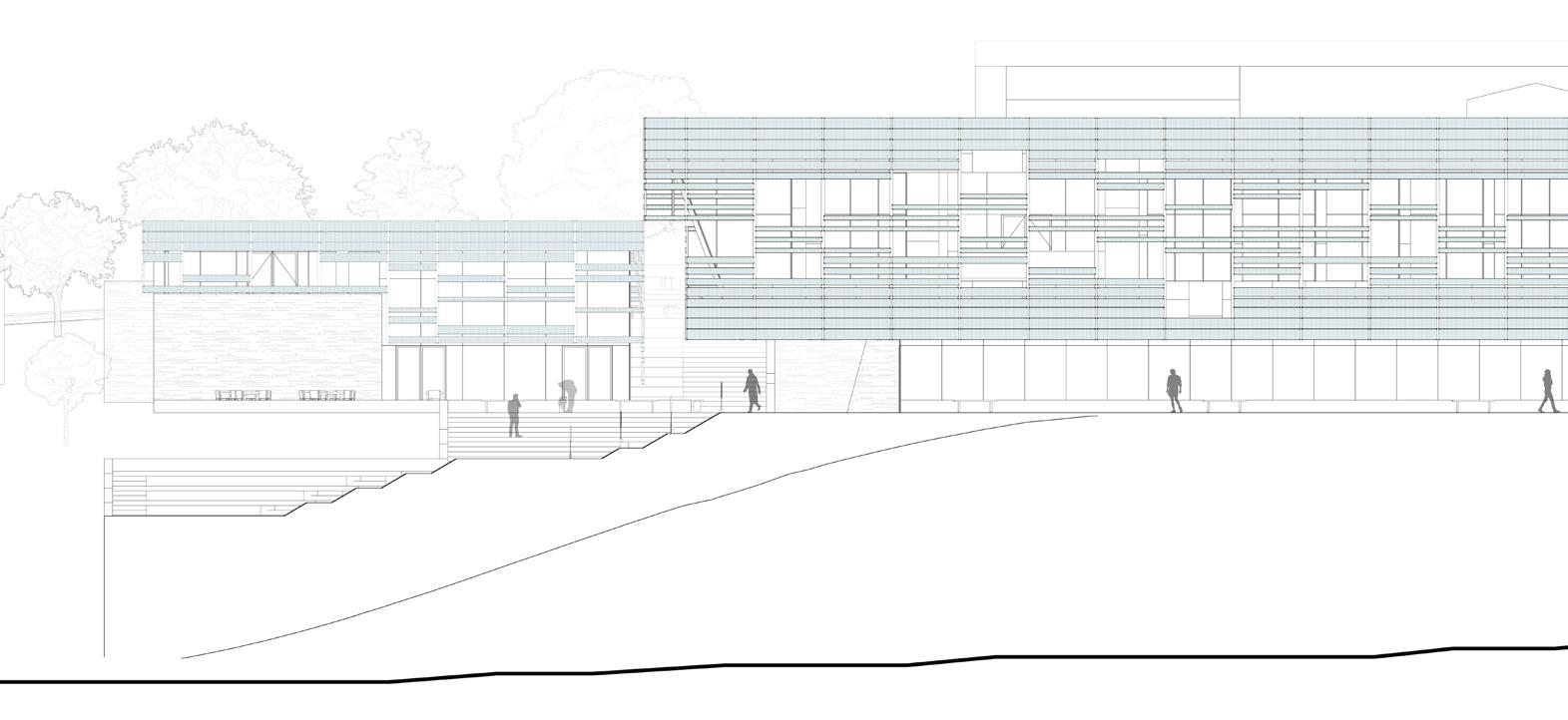 A SERIES OF MASS TIMBER PRODUCTS MADE UP THE MAJORITY OF THE STRUCTURE OF THE PROJECT. MANY GLUE LAMINATED BEAMS AND COLUMNS SUPPORTED THE BUILDING MASSES WHILE TWO CUSTOM GLUE LAMINATED TRUSSES WERE UTILIZED TO ACHIEVE A MASSIVE CANTILEVER. A GALVANIZED STEEL SKIN PROTECTED THE MASS TIMBER STRUCTURE AND A CUSTOM GLASS FAÇADE SHADED THE INTERIOR OF THE PROJECT. THE CUSTOM GLASS FACADE APPLIED AN OPAQUE GLASS PANEL SYSTEM THAT IS HELD UP BY STEEL FASTENERS AND GALVANIZED ALUMINUM CLIPS. TO TAKE ADVANTAGE OF THE DRAINAGE, A STONE RETAINING WALL LINES THE SOUTH EDGE OF THE SITE TO BE UTILIZED AS A MAIN COLLECTION SOURCE FOR WATER RUNOFF.