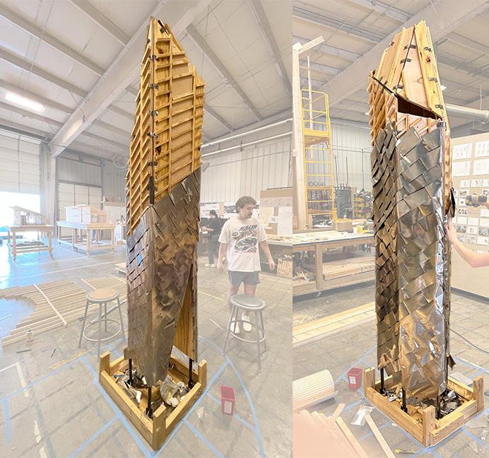 THIS PARTICULAR STUDIO REQUIRED MANY MODEL BUILDING EXPERIEMENTS TO IRON OUT THE DETAILS OF THE PROJECT. FOR THE DURATION OF THE SEMESTER, WE MAINLY WORKED ON MOCKUPS FOR A 1/3’’ SCALE MODEL, AND A 1 TO 1 PARTIAL SCALE MODEL. I HELPED MANAGE THE CONSTRUCTION OF THE BOTH PROJECTS, BUT MY MAIN FOCUS WAS ON THE ENCLOSURE, OR BREAKING SYSTEM THAT WOULD PROTECT THE NLT. WHILE HELPING MY TEAM MEMBERS I WAS ALSO TESTING A BREAK AND SOLDERING TEST ON BOTH OF THE SCALE MODELS TO DEVELOP A DETAIL FOR THE CONSTRUCTION OF PROJECT.