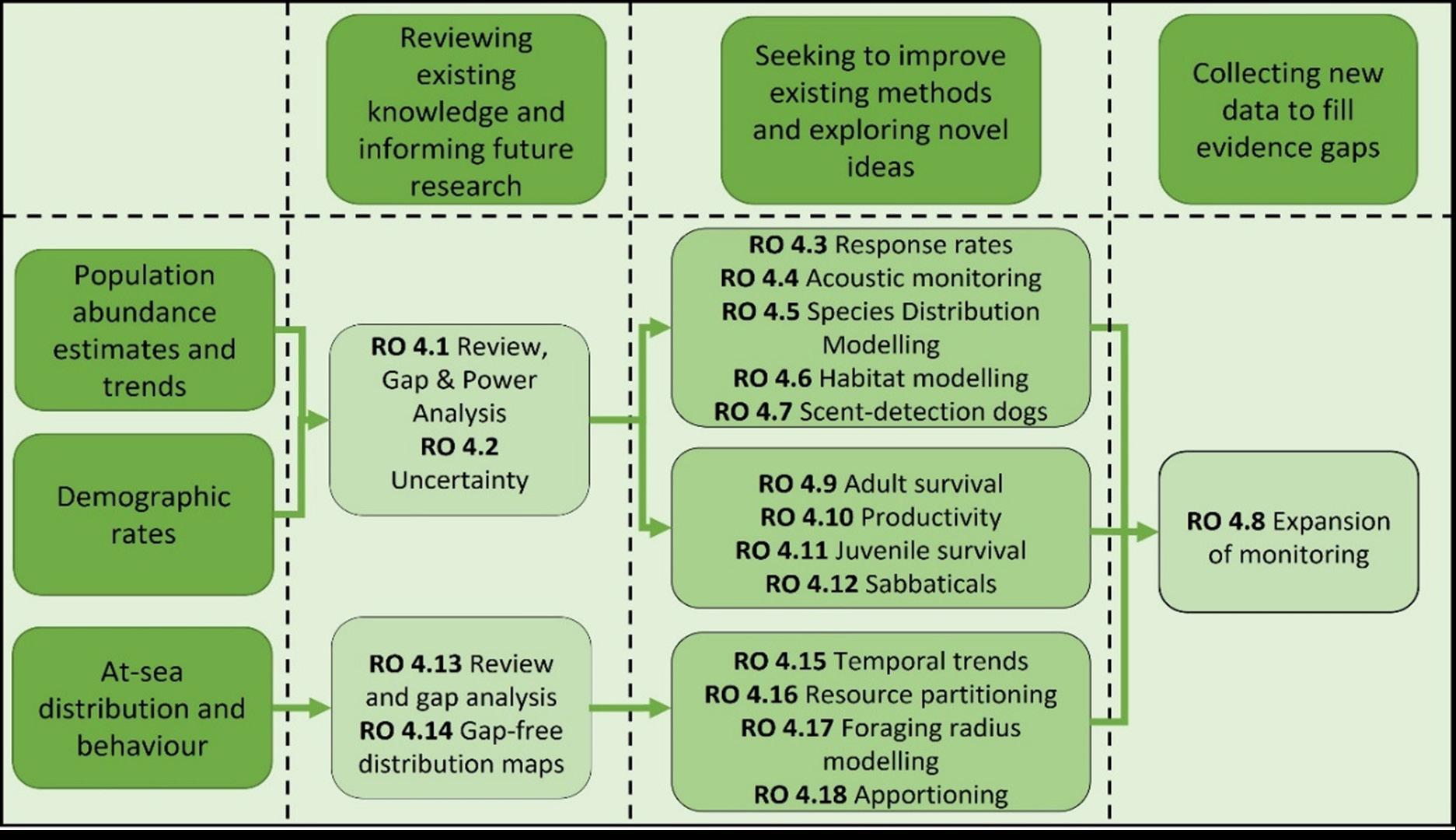 OWSMRF produced four reports, KG1, KG2, KG3 and KG4. Research ideas that emerged from the Pilot Year were summarised into a set of concept notes. Of the research identified, five priority projects have been developed into detailed scopes of work. Most research ideas identified for kittiwakes have already been taken forward by various delivery bodies and funders.