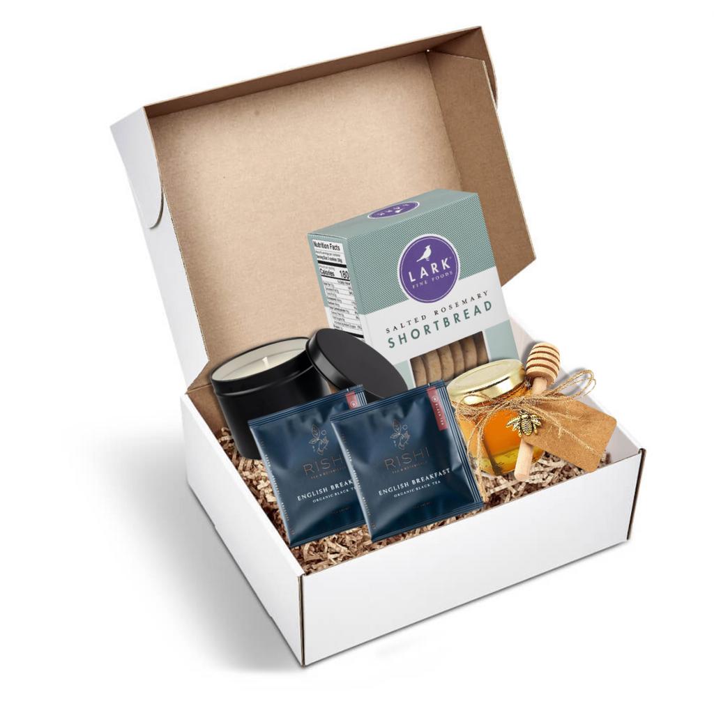 This gift will be packaged in our signature white gift box, finished with gold ribbon. The gift contents will be nestled into ivory or kraft crinkle paper.