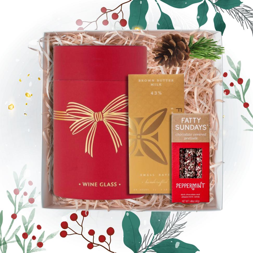 Unwrap the joy of the holiday season with our Red Christmas Box, featuring an elegantly adorned wine glass, a smooth milk chocolate bar, and delectable peppermint chocolate pretzels, creating a perfect combination of festive indulgence.