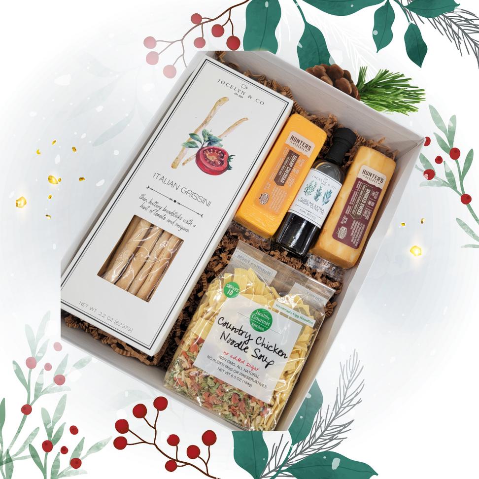 Elevate your holiday brunch with our delectable gift box, featuring a comforting chicken noodle soup kit, two artisan cheeses from Wisconsin, flavorful olive oil for dipping, and crispy Italian breadsticks, creating a perfect harmony of flavors for a delightful gathering
