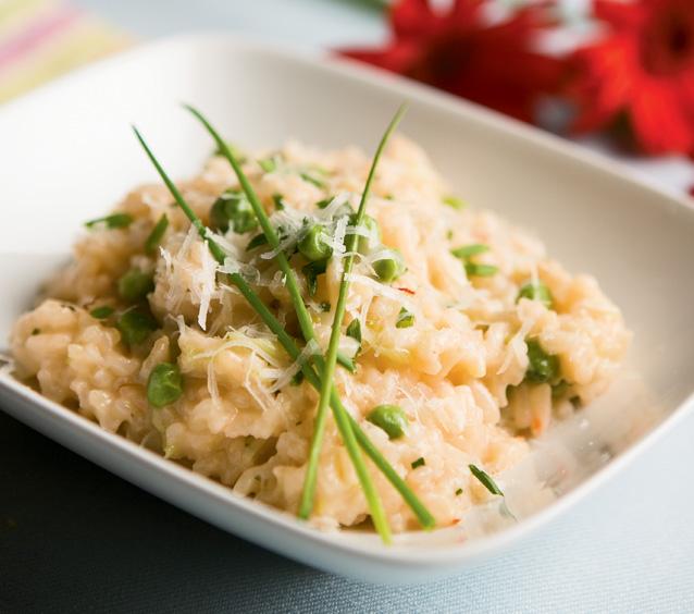 5. Stir in minced herbs, leeks and peas. Add remaining butter and cheese. Stir well and then let rest for 3-5 minutes. Add salt and pepper to taste.