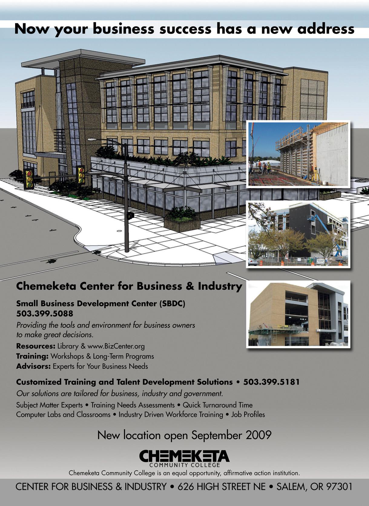 The college is opening the new Chemeketa Center for Business & Industry in fall 2009. It will house the college’s workforce and business development programs and serve as a strong bridge to the business sector. – Joe Morris