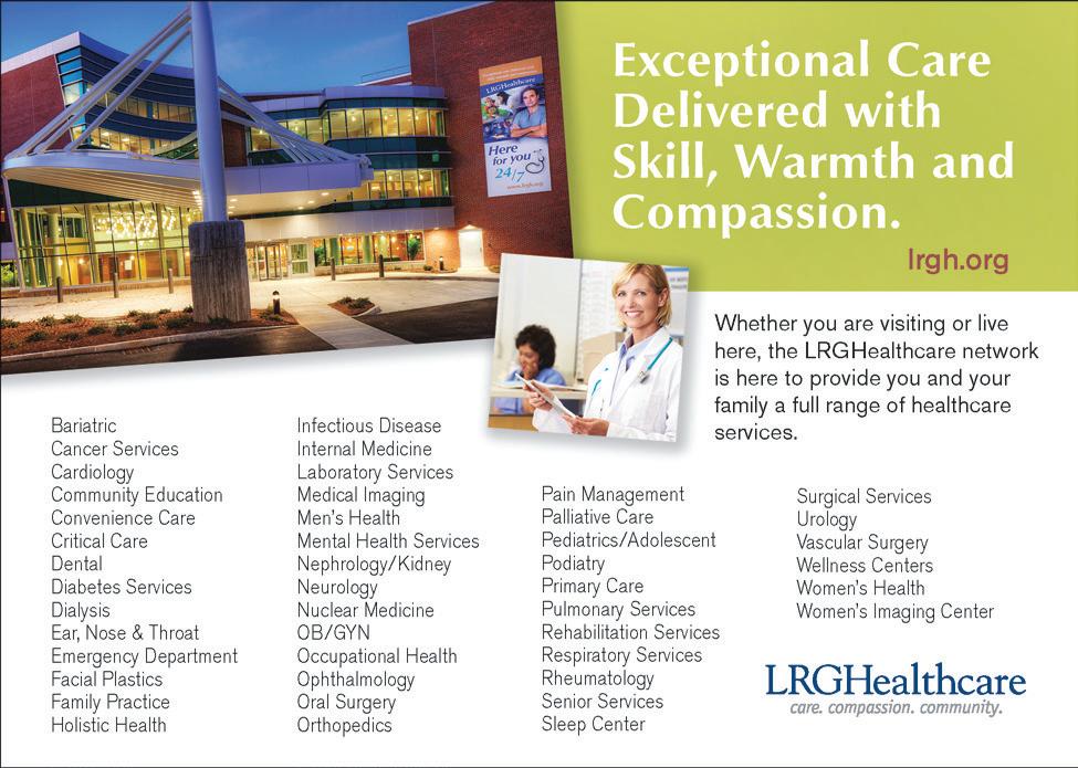 Comprising l akes region general hospital, Franklin regional hospital, and 22 affiliated medical providers and service programs in the Lakes and Three Rivers regions, lrghealthcare’s goal is “strengthening the community’s well-being by providing patients with the highest quality health care.” LRGHealthcare offers state-of-theart medical facilities and services of more than 200 physicians representing 35 medical specialties. LRGHealthcare also employs 1,600 people, making it the largest employer in the area.