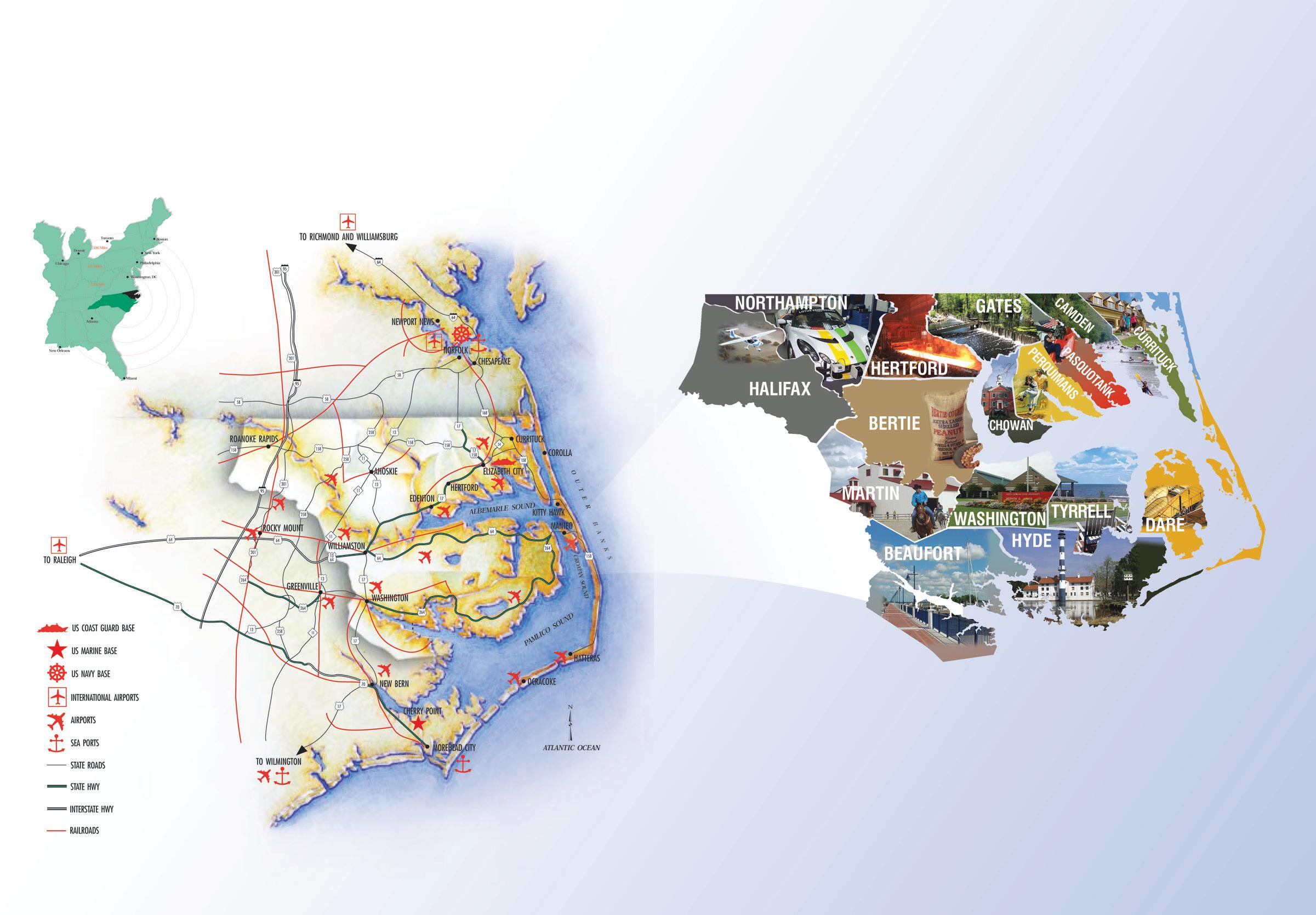 North carolina’s Northeast Region encompasses 16 counties, including the outer Banks region, and has a combined labor force of 168,786. top industry sectors in the region include manufacturing, aviation and aerospace, marine trades, tourism and growing sectors in biotechnology, automotive research and development, and alternative energy. Most counties qualify for maximum state incentives. For more information, visit North carolina’s Northeast commission online at www.ncnortheast.com or call (252) 482-4333.