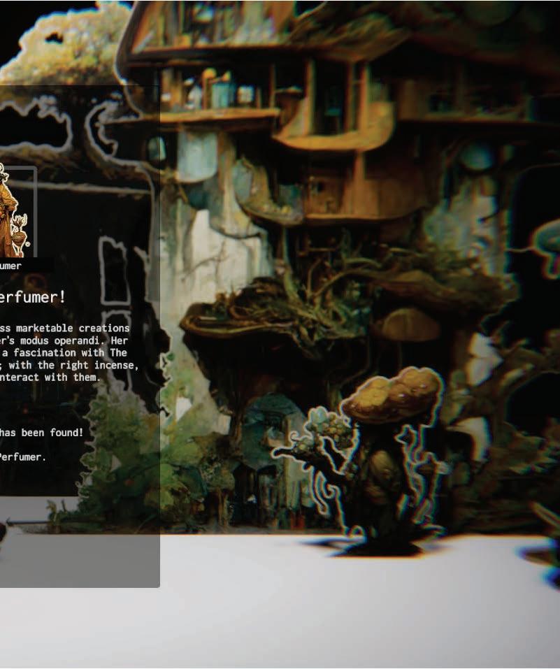 a sticker-like visual language is used, placing 2d billboards within a 3d space. each npc has a unique visual and character that corresponds with their respective areas; the carnival is pink and weird, the forest is a blue-green flora, et cetera. midjourney is employed to generate these sprite sheets within the style of peter mohrbacher.