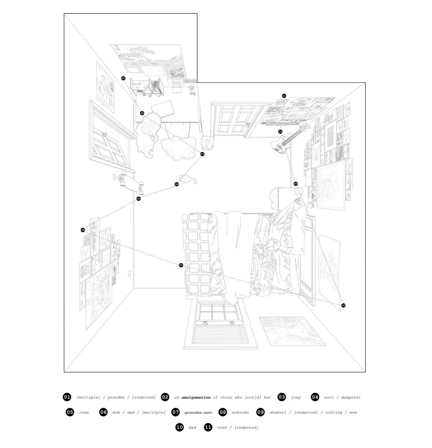 this is a continuous project, one that grows as i become sentimental or bored. more corners of [room] will be drawn and lightly analyzed for personal associations.