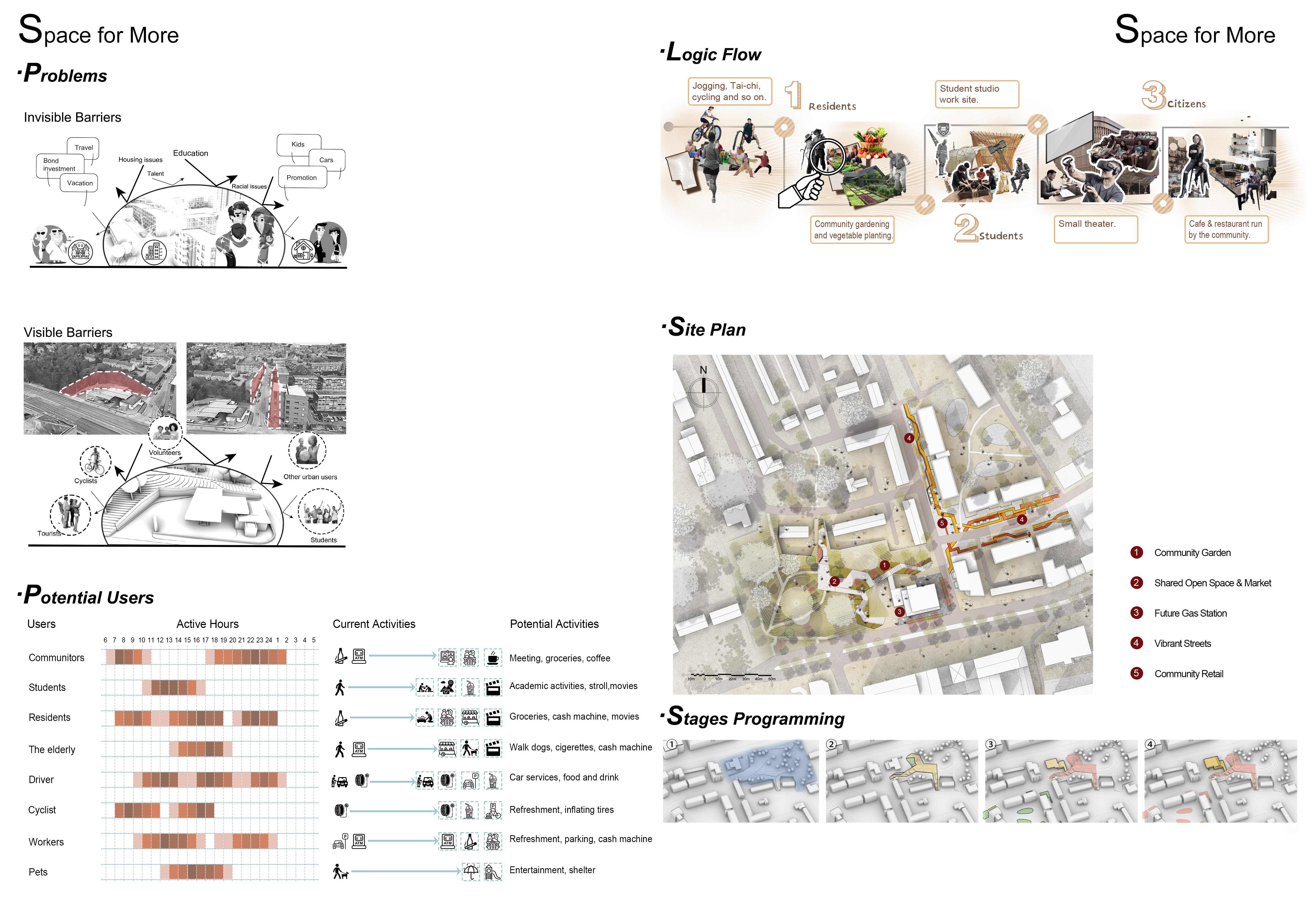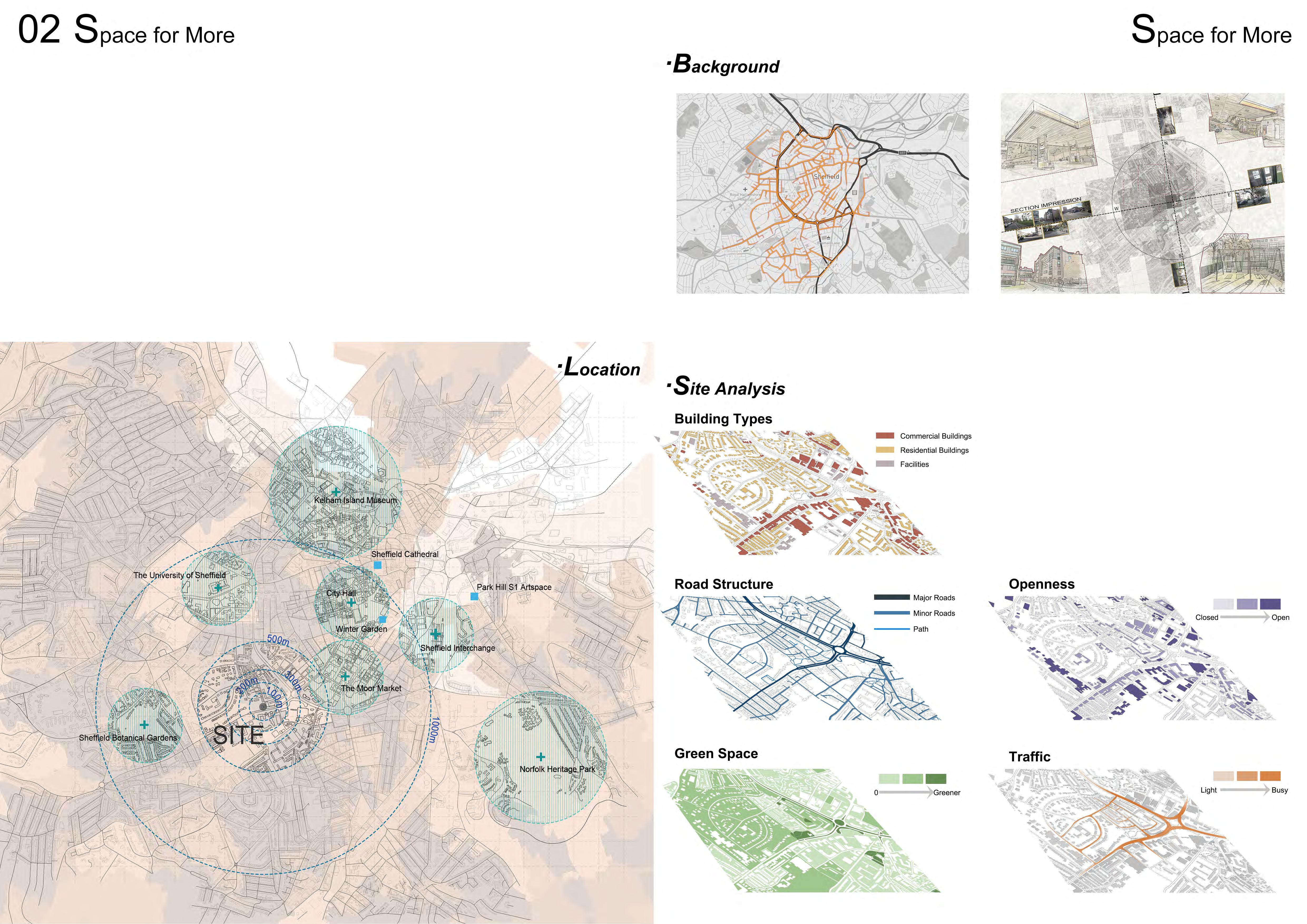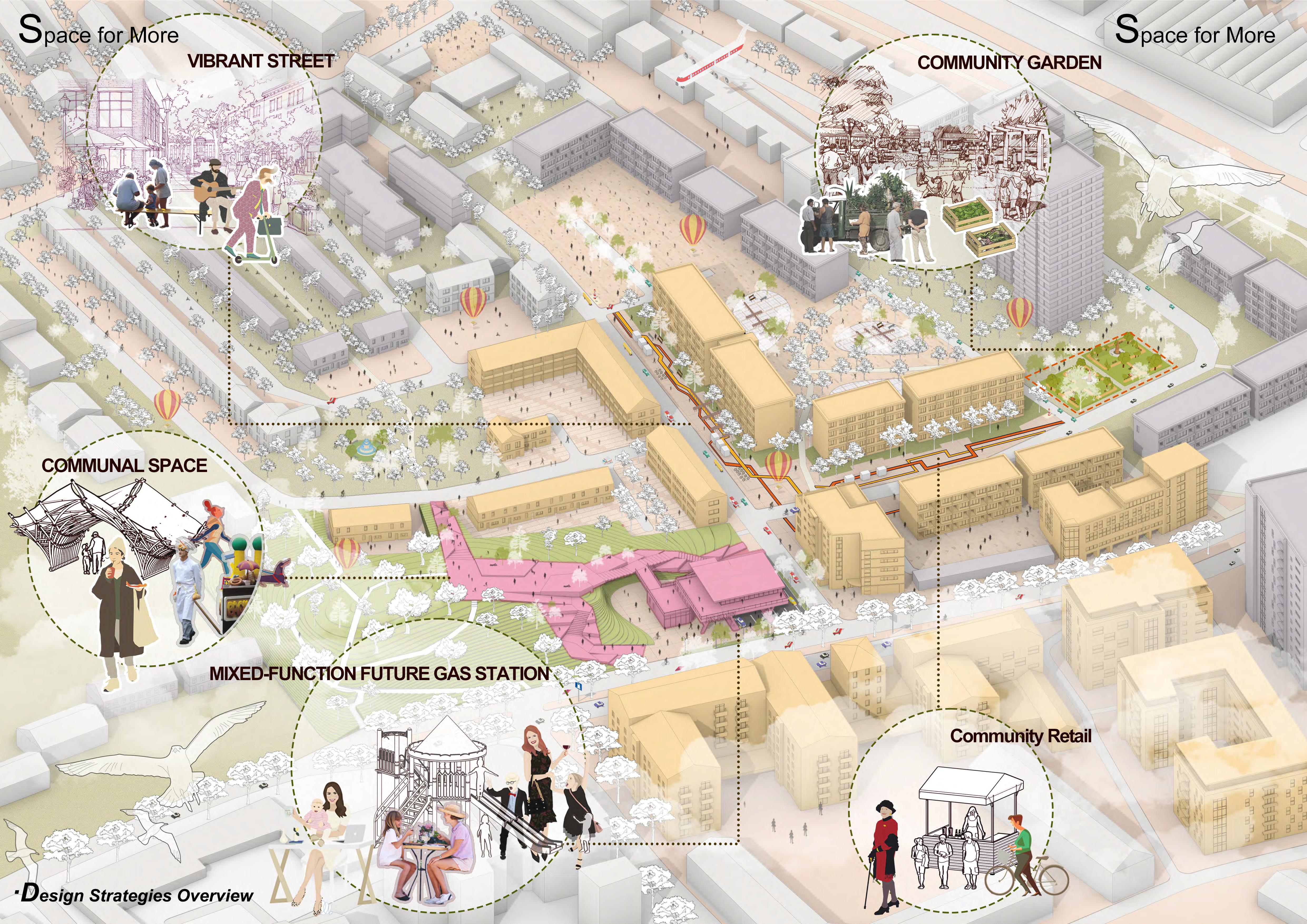 The north to the gas station is a relatively closed residential area, and the south is a business area. But from the analysis of road structure we can see that the traffic connections in this large area are very weak. the amount of greenery in residential areas is very high. But the chance of social activities that can happen indoors is less. The road between residential and commercial areas has a lot of traffic, which means the gas station or this area has the potential to be used by more people. This information forms the basis for our subsequent design.