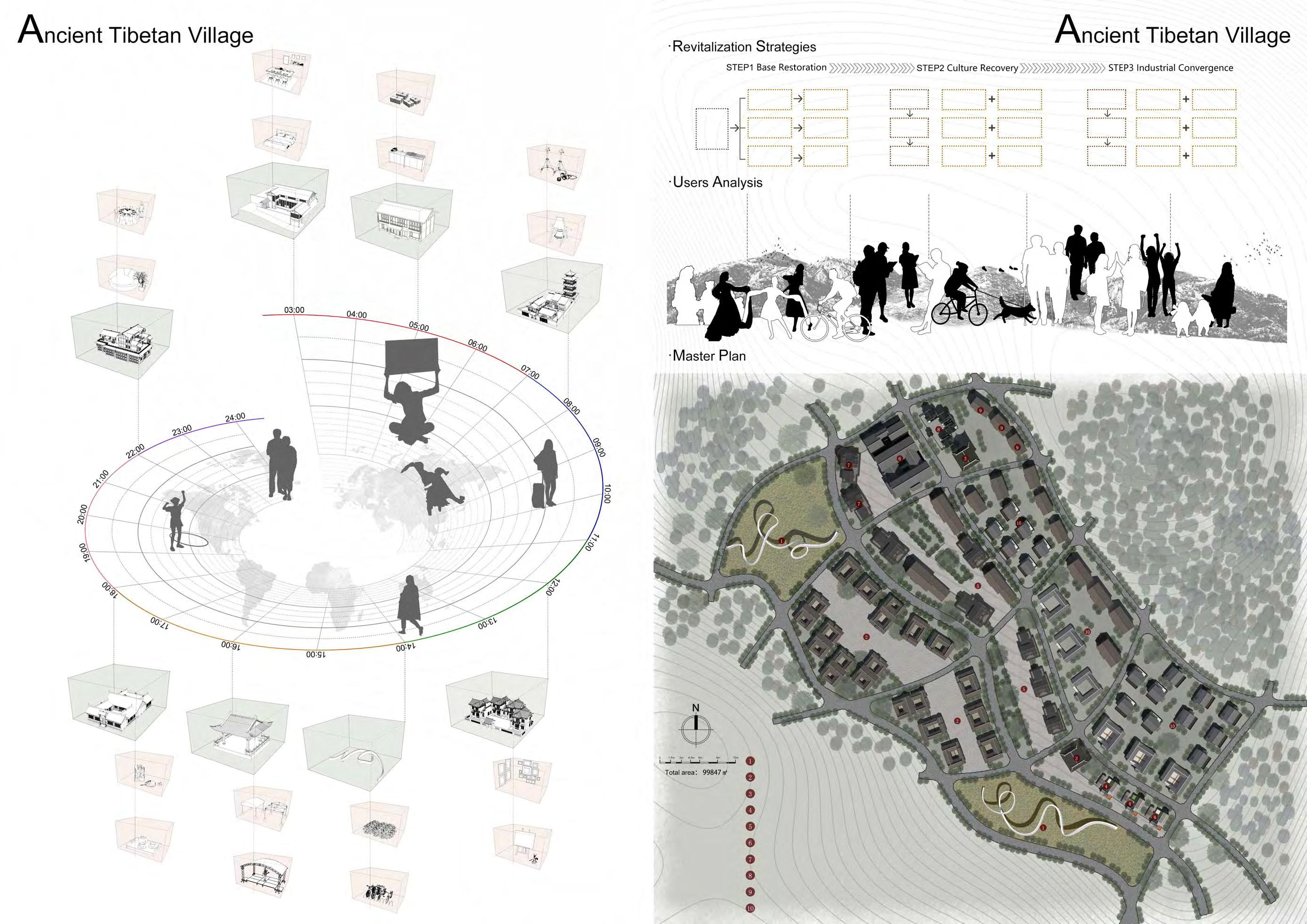 According to the analysis and positioning, the functions of the ancient Tibetan village are artist studios , characteristic homestay, local dwellings , Thangka paintings , museum exhibition of Tibetan Medicine, commercial street of Tibetan art and culture, catering and leisure and health care experience hall of the Tibetan medicine. The distribution is shown in the figure.