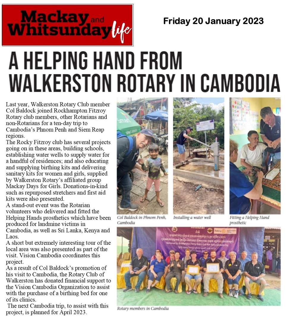 Last year, Walkerston Rotary Club Member, Col Baldock joined Rockhampton Fitzroy Rotary club members, other Rotarians and nonRotarians for a ten-day trip to Cambodia's Phnom Penh and Siem Reapregions.