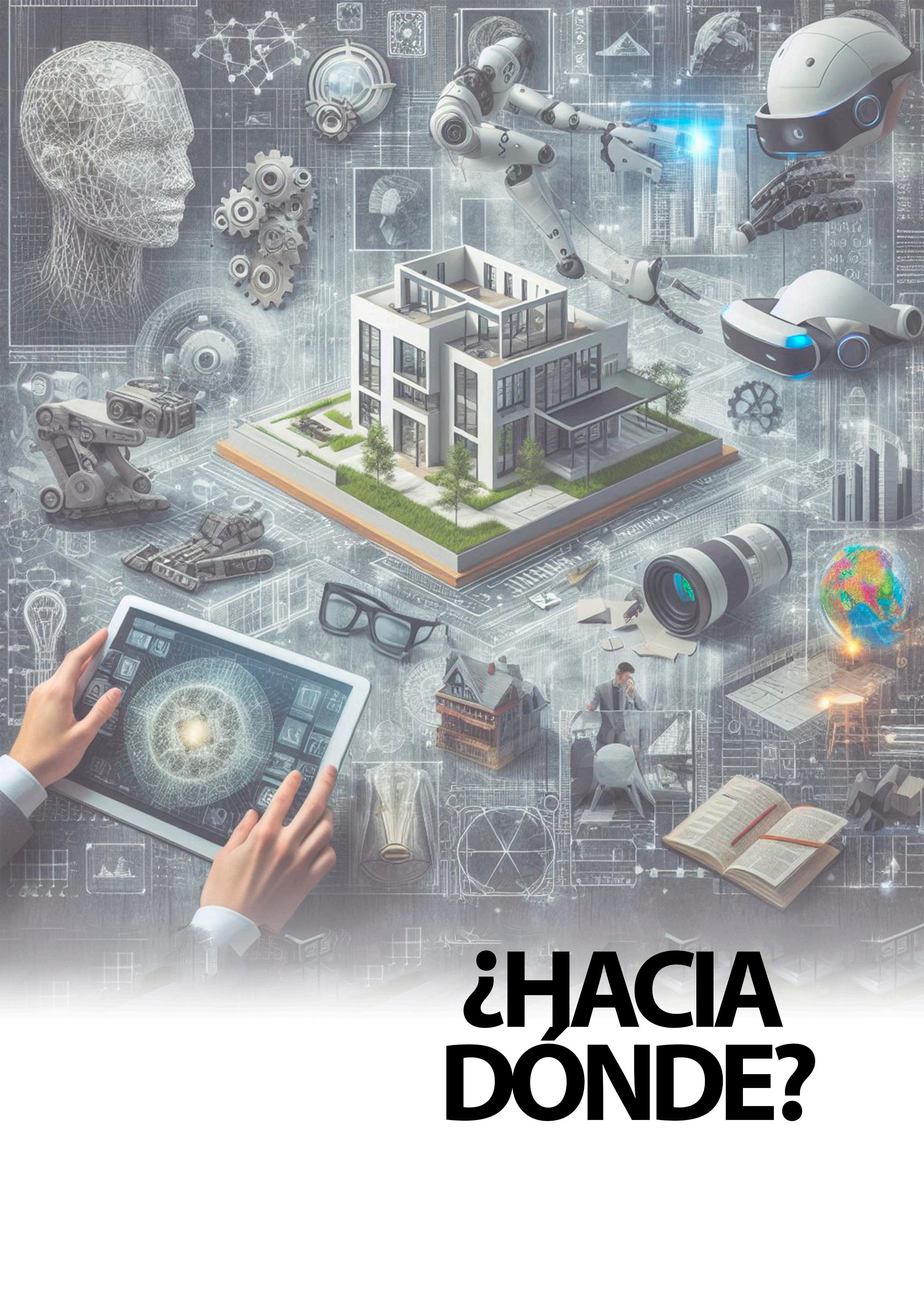 A collage that talks about Artificial Intelligence related to Architecture. It must show technologies such as DALL-E, image generation, augmented reality lenses, robots, etc.”