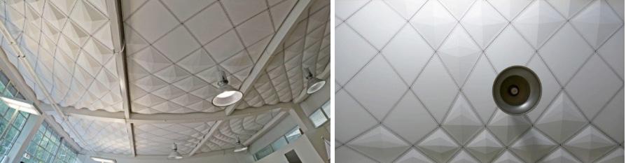 Es dentro de este marco de cuestionamiento, donde Ballesteros expone un trabajo propio, donde la parametrización fue utilizada como herramienta de proceso proyectual para el diseño de un techo acústico para el estudio de Design to Production. Se utilizó un modelo de diseño asociativo en Grasshopper que actúa como interfaz entre el proceso de diseño y la fabricación. La idea generativa del proyecto comienza con una base geométrica de rombos. En lugar de distinguir explícitamente la geometría, se introduce un árbol de datos, en el cual se representan los distintos tipos de rombos o triángulos que tenemos, representando todas las esquinas, incluso si no existieran. La estructura general se divide en 6 campos. Tomando en cuenta las gradientes del ruido, se aplica una forma de rombo en el centro y de triángulos en los bordes. Se fabrica de manera digital con una tolerancia de 0,5mm. De esta manera se obtiene un modelo de 354 maderas interconectadas que dan forma y estructura a la obra, respondiendo cada una de manera particular a la demanda acústica de su ubicación. Para su fabricación se utilizó maquinaria CNC. Específicamente con 3-axis, corte láser y corte directo en cada pieza.