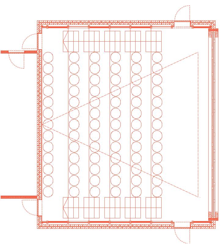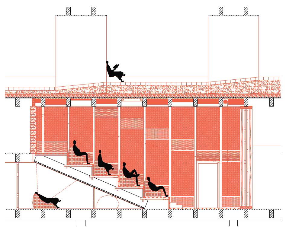 Even when the spaces are centralized and layered, they all exist symbiotically and harmonically, this indicating a unity between reality and fantasy. Also, as a larger reminder of where our cinema is placed (the parking lot), the walls separating the walls from the parking lot will be of translucent recycled material.