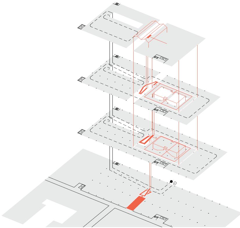 Lastly, the design of the central park maintains the descending nature of the earth. The park is divided into plazas of various levels and functions which are then connected with ramps, making the whole site completely accessible to wheelchairs. The main building is positioned on the lowest area of the land, providing the main access to the site. It is most exposed to the roads (allowing for a vehicle drop-off area) and positioned towards Jabal AlWeibdeh’s most prominent view; the archaeological site of the Citadel. All buildings can be accessed from different borders of the neighbourhood’s block while, at the same time, can also be accessed through the central connecting volume - the park - from within the block.