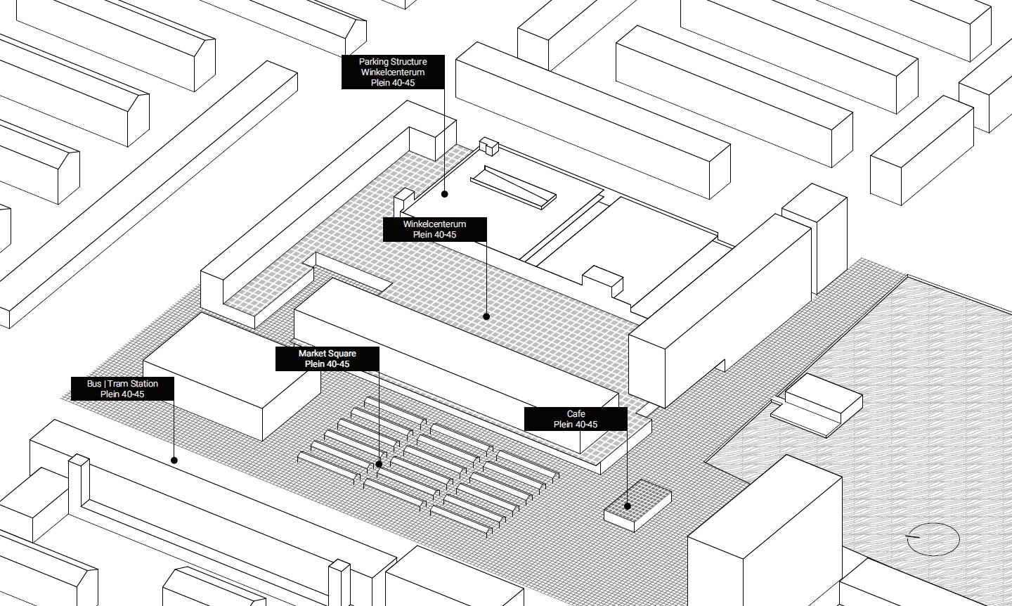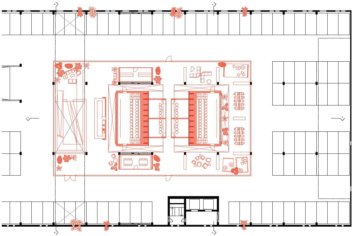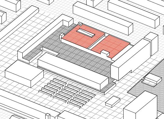 Moving people from the outdoor reality and into the cinema’s world of fantasy by creating a path through different layers. Each layer serves a function that draws the user closer to the cinema. From an outdoor garden to a library’s lounge to the cinema, all defined by spaces that are based/divided by the parking lot s grid, users feel that they’re being enclosed more and more as they reach the cinema. Once the user reaches the core (there will be two types of cinemas present 1. A normal cinema 2. a smaller/cozier cinema where users may lie down on the floor in small groups and watch a movie on the ceiling.